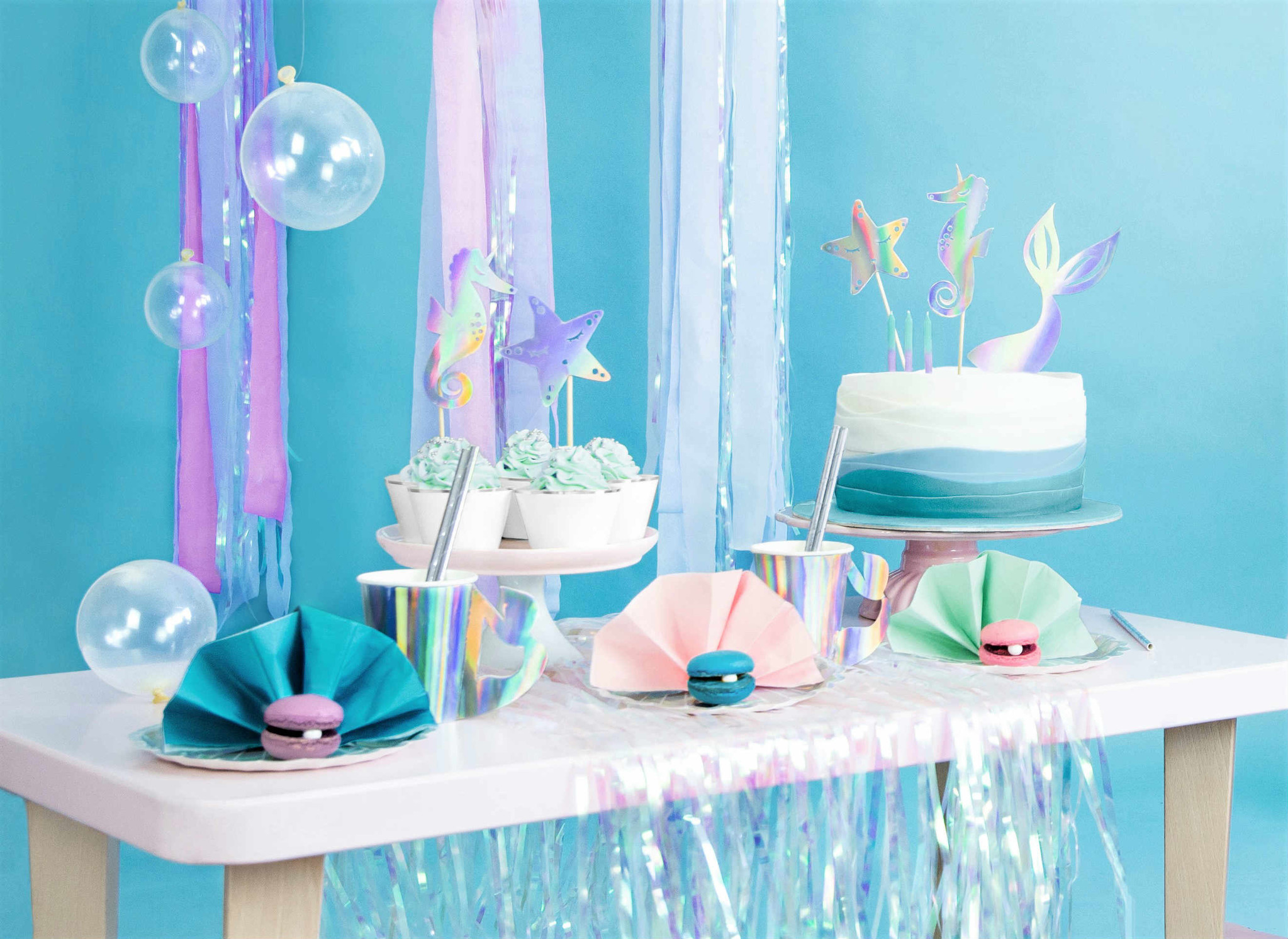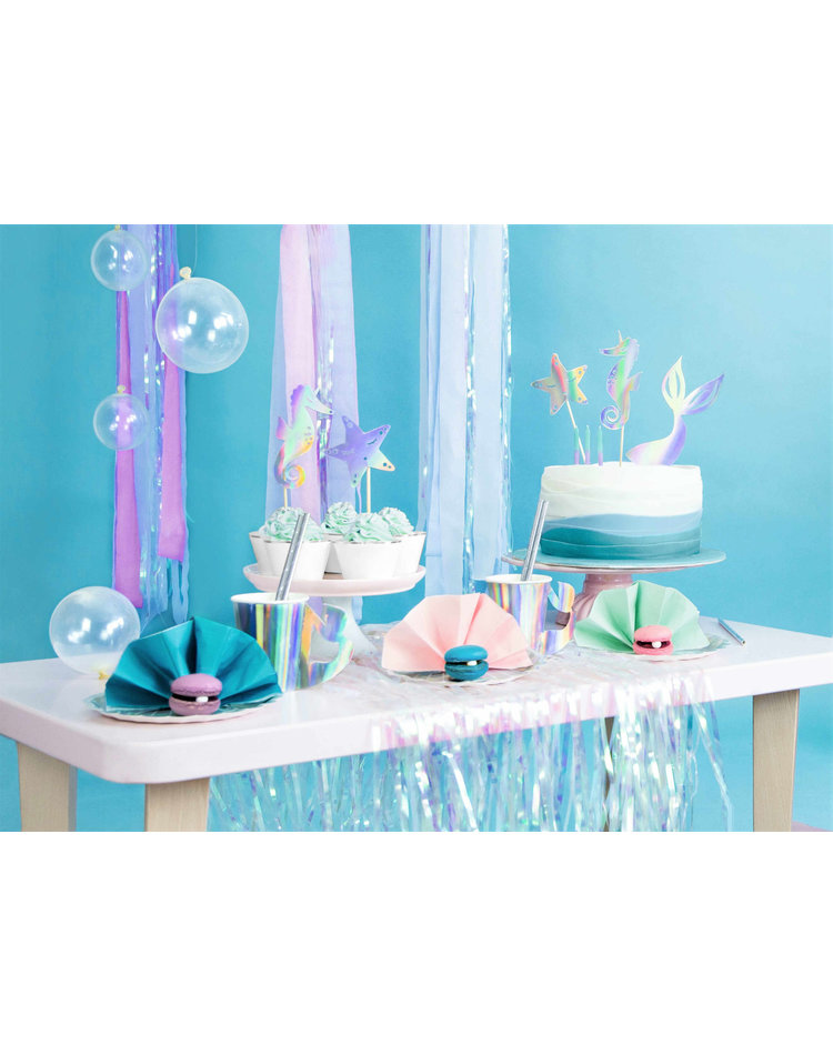 Tipp: Entdecken Sie zudem weitere Produkte aus unserer opalisierenden Partyreihe, wie Partybecher mit Flossen-Henkel, Teller in Muschelform und schimmerndes Konfetti. Des Weiteren können Sie in Kombination mit hellblauen, fliederfarbenen und weißen, sowie silbernen Artikeln eine magische Unterwasserwelt-Atmosphäre erschaffen.