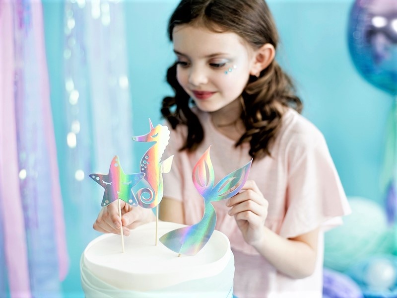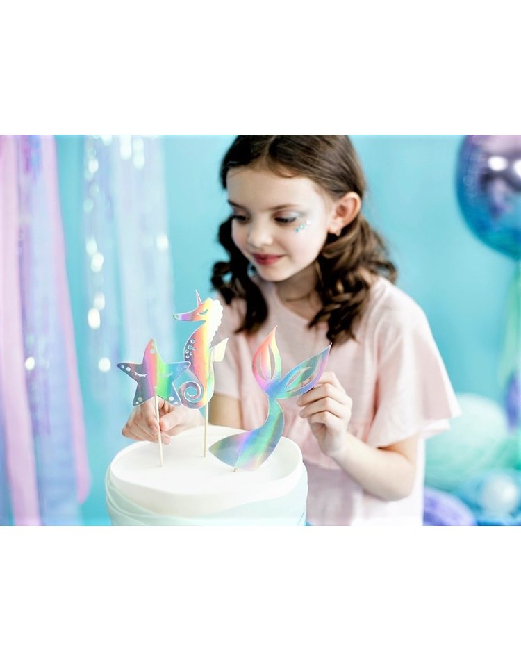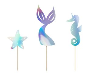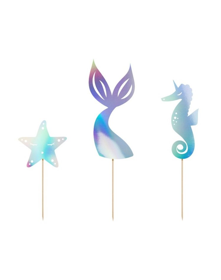 Meereszauber – Verwandeln Sie auch die kleinen Köstlichkeiten auf Ihrer Party ganz im Stil der zauberhaften Lebenswelt einer Meerjungfrau. Sie erhalten drei Topper aus festem Papier in den Motiven eines Seesterns, Seepferdchens und einer Flosse, welche einseitig mit opalisierender Folie versehen sind. Mit den enthaltenen Holzstäbchen verzieren sie einfach Torten, Kuchen, Muffins oder Cupcakes ganz nach Ihrem Belieben.