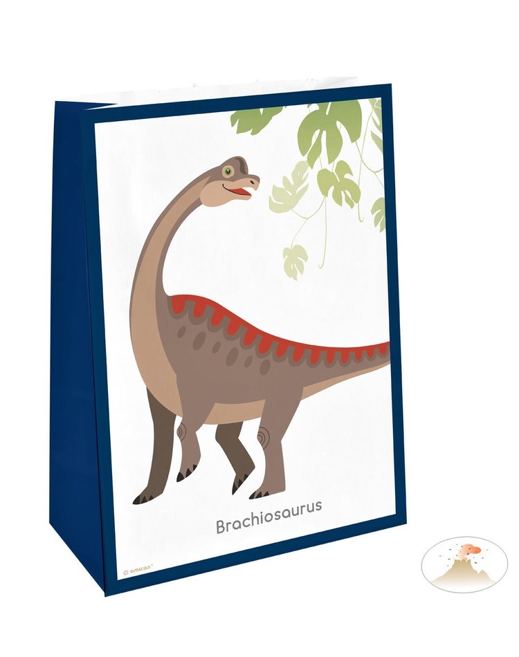 Seien Sie kreativ mit diesen Papiertüten im Dino Look! Integrieren Sie diese in Ihre Tischdekoration, oder geben Sie diese gefüllt als Gastgeschenk mit. Sie erhalten vier Papiertüten in den Maßen 21x15cm. Die Geschenktüten sind in hauptsächlich in blau gehalten. Auf der weißen Vorderseite ist ein Dino inklusive Beschriftung abgebildet. Damit Sie die Tüten verschließen können, sind zusätzlich vier Vulkan-Sticker enthalten. Sie können die Geschenktüten mit weiteren Artikeln aus der Dino-Party Serie kombinieren.