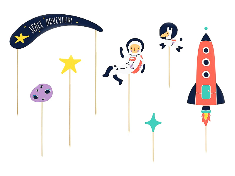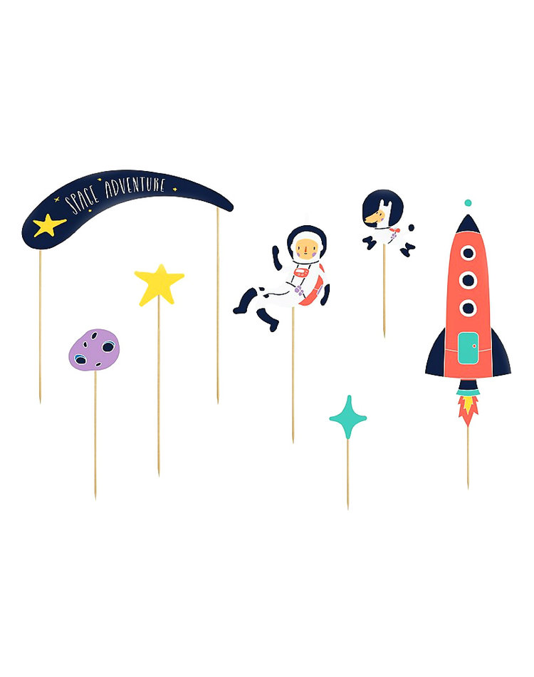 Galaktischer Gaumenschmaus – Machen Sie aus einem einfachen Sahnegebäck eine Astronauten-Torte der Extraklasse! Dieses 7-teilige Set (9,5 - 24,5 cm) besteht aus Holz-Pickern mit lustigen und coolen Weltraum-Motiven. Sowohl ein Astronaut als auch ein Astronauten-Hund, Sterne, Gestein, ein Schriftzug „Space-Adventures" und eine Rakete schweben über der Geburtstagstorte und sorgen bei den Kindern für Begeisterung beim Essen.