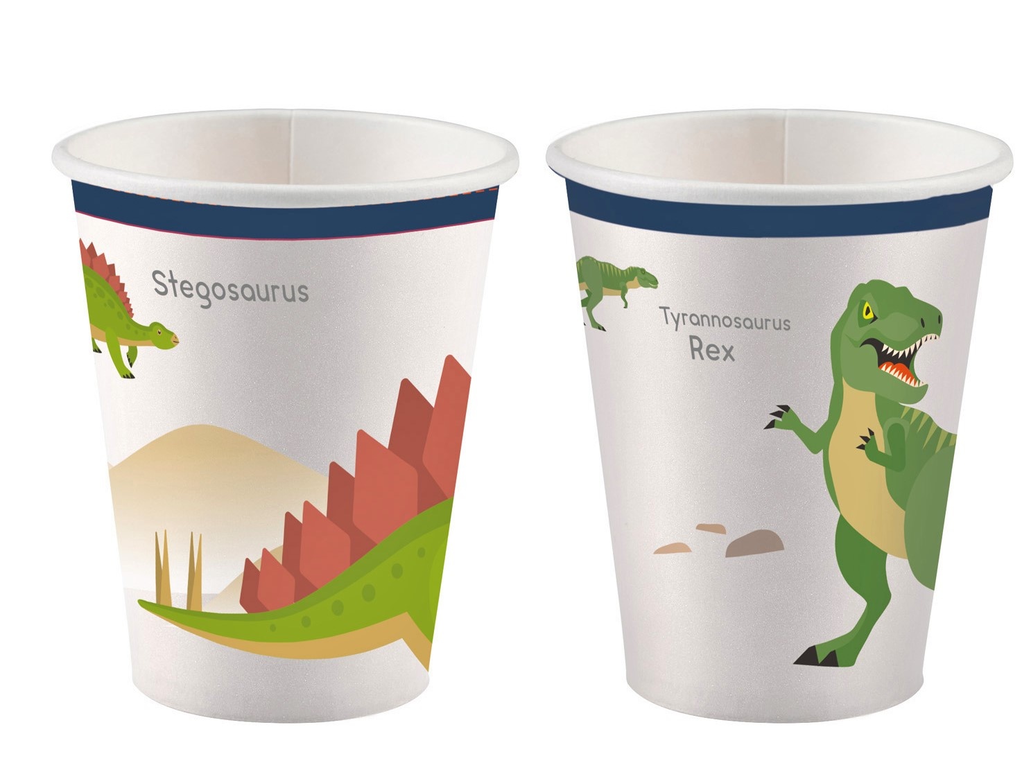 Lassen Sie die Dinos auf Ihrer Festtafel einziehen! Diese weißen Papierbecher sind mit einem blauen Rand und zwei verschiedenen Dino Motiven dekoriert. Damit Ihre kleinen Gäste einen Lerneffekt haben, befinden sich die Namen der Dinos ebenfalls abgebildet. Sie bekommen acht Becher mit einem Fassungsvermögen von 250ml. Bitte befüllen Sie diese ausschließlich mit kalten Getränken. Benötigen Sie für Ihr Geburtstagstisch weitere Dino Teller, Servietten oder Ballons? In unserem Sortiment werden Sie fündig.