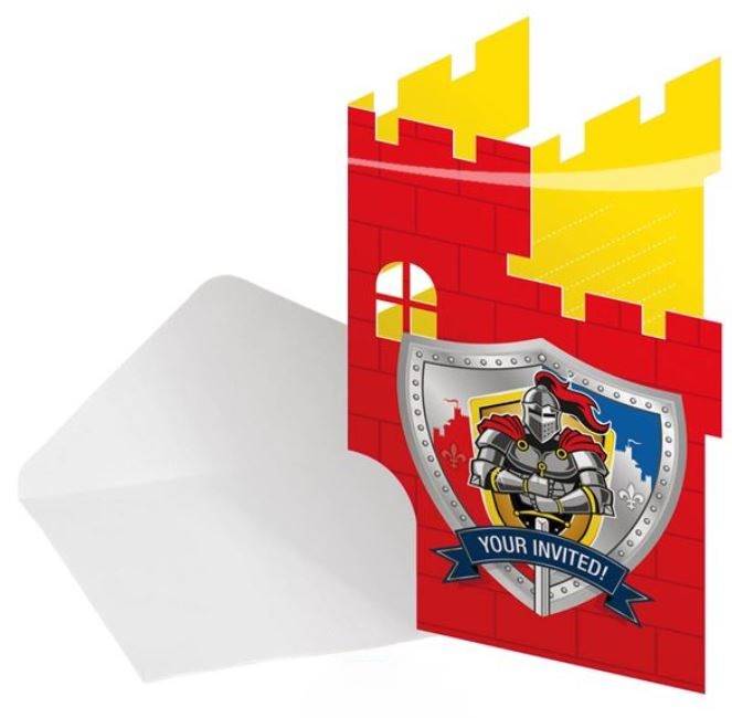 Die Einladung für die nächste Ritterparty ist gesichert! Und bei dieser coolen Klappkarte wird wohl kaum jemand absagen. Die Karte in Form einer Burg ist außen Rot und innen Gelb. Auf der roten Seite ist ein Ritter-Emblem mit einem furchteinflößenden Rittermotiv und dem Motto „Your invited“. Die weißen Umschläge zu den acht Einladungskarten kommen gleich mit.