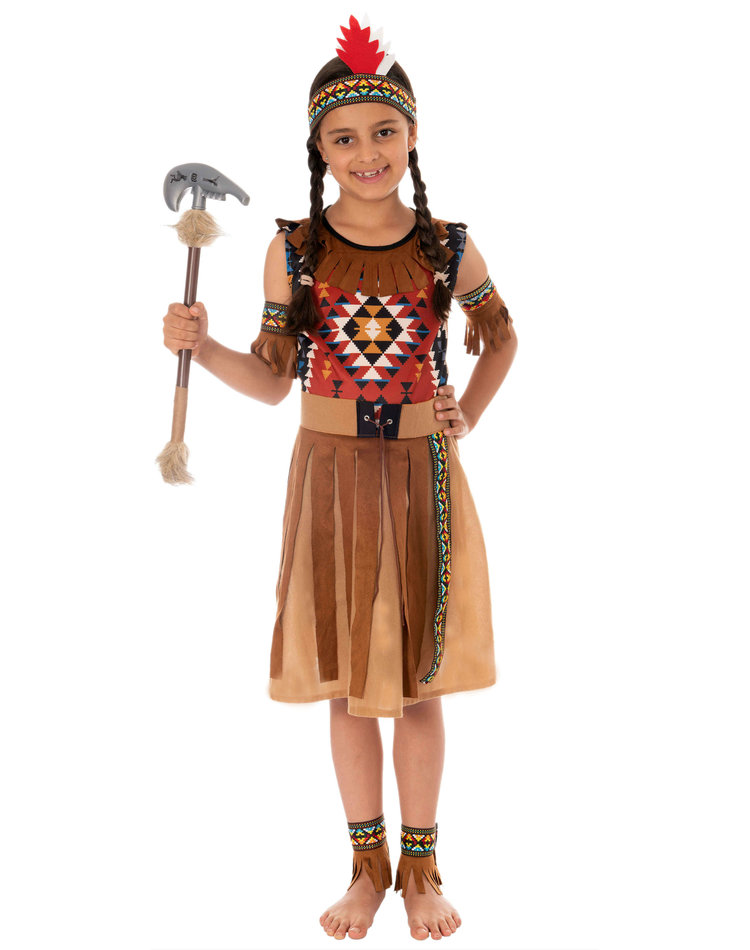 Howgh! Ein knielanges Kleid für kleine Indianerinnen in typischem Sandbraun. Mit diesem Outfit verwandelt sich ihr Nachwuchs im Handumdrehen in eine Häuptlingstochter und gleichsam zum Star einer jeden Kostümfeier. Das Kleid ist auf dem Oberteil mit einem bunten Aztekenprint und einem Kragen mit Fransen versehen. Auch der Gürtel sowie die Arm-, und Fußgelenkbänder verfügen über die Fransen in Wildleder-Optik und sorgen für den charakteristischen Indianerlook. Das bunte Printmuster wiederholt sich ebenfalls an Bändern, Gürtel und dem schicken Stirnband mit Blattmotiv.