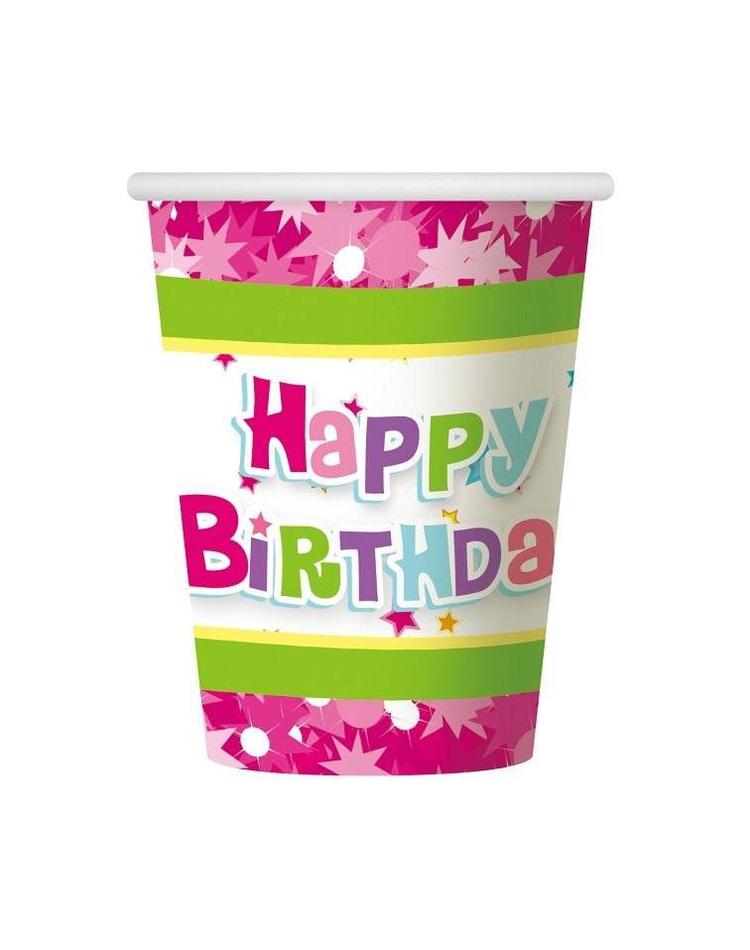 Die rosafarbenen Partybecher haben „Happy Birthday“ als Motiv und verfügen darüber hinaus über einen Druck mit kleinen und großen Sternen. Nicht nur kleine Mädchen haben große Freude an den fröhlichen Pappbechern, aus denen jedes Getränk ganz besonders schmeckt. Passend dazu sind Partyhüte und Pappteller erhältlich, welche die zusammenpassende Dekoration vervollständigen.