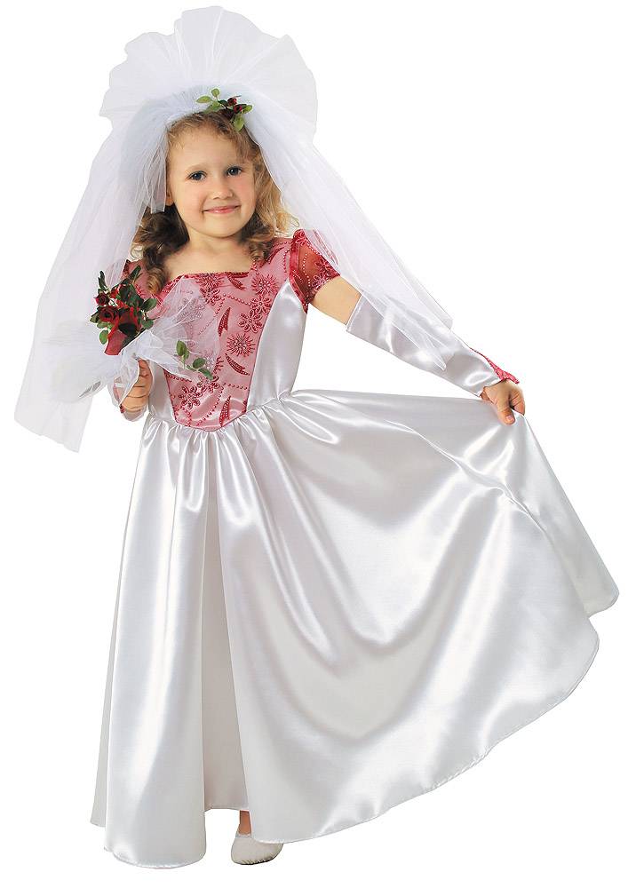 Viele Mädchen träumen davon, in einem weißen Kleid zu heiraten. Auch wenn es noch einige Jahre dauern wird, können kleine Mädchen an Karneval schon mal in den Zukunftstraum schlüpfen. Das weiße Brautkleid für Kinder besteht aus glänzendem Satin. An den weit fallenden Rock schließt sich ein edles Oberteil aus roter Spitze mit Puffärmelchen an. Elegante Handschuhe und sogar ein Blumenstrauß sind die perfekten Accessoires, die nur von dem hübschen Schleier übertroffen werden. Ob an Karnevals, auf Motto-Partys, bei Kinderfesten und Geburtstagen, in diesem Brautkleid wird Ihre Kleine immer auffallen.