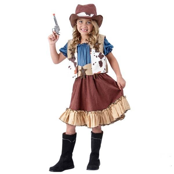 Lieferumfang: Cowgirl Kostüm für Kind bestehend aus aus einem Rock mit Gürtel, einer Bluse mit einer angenähten Weste und einen Cowboy Hut. Pistole und Stiefel sind in der Lieferung nicht enthalten.