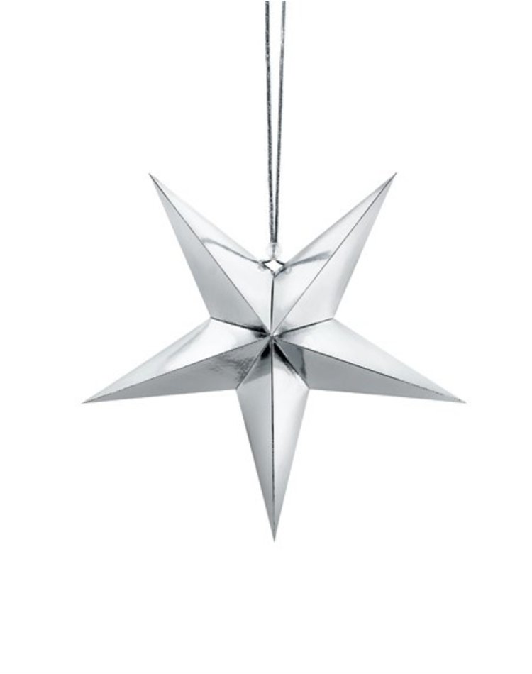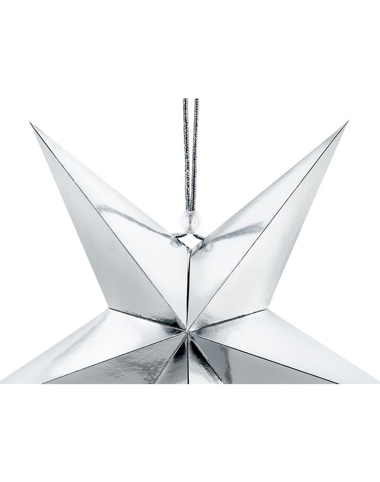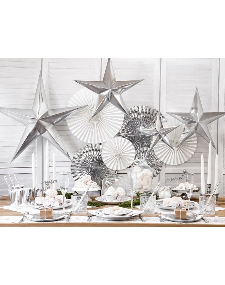 Festliche Stimmung – Zwischen Planeten, Robotern und Aliens auf der Space-Party oder zur Weihnachtszeit beim Tannenbaum. Dieser Deko-Stern in silber-metallischem Glanz lässt sich vielseitig auf Partys einsetzen. Sie erhalten einen 3D-Stern aus festem Papier mit einem Durchmesser von 30 cm.