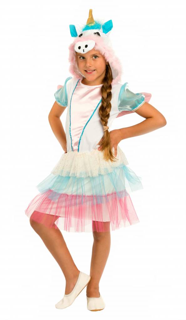 Lieferumfang: Einhorn Kostüm für Kinder - Mädchen bestehed aus einem Einhornkleid mit Kapuze und rosa Flügeln (ohne Schuhe)