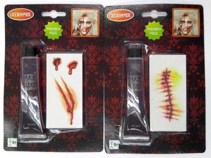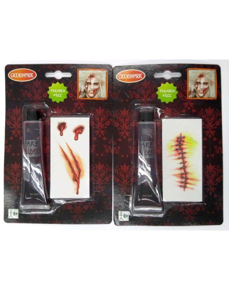 Das Halloween falsches Blut und Halloween Tatoos (falsche Narbe) sind die perfekte Ergänzung für Vampir- oder Zombie-Kostüme. Ohne Parabene. Leicht abwaschbar.