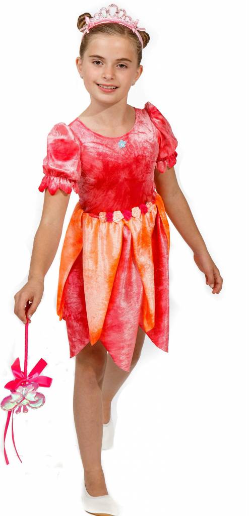 Es besteht aus einem Kleid in elegant-leuchtendem Rot im Samtlook. Unter der Hüfte sind in passendem dezenten Orange lange Spitzen angenäht, die sich mit dem Rot im Rockbereich ergänzen wie eine zweifarbige Blume. Im Hüftbereich sind Blumen als Verzierung angebracht und auch unter dem Hals ist im Brustbereich ein silberner Stern zu sehen. Komplettiert kann das Kinderkostüm Fee werden durch den Haarreifen mit Kunst-Edelsteinen und rosa Rand sowie dem Feen-Zauberstab mit Schleife und Blütenblättern. Das passende Zubehör bekommen Sie in unserem Shop.