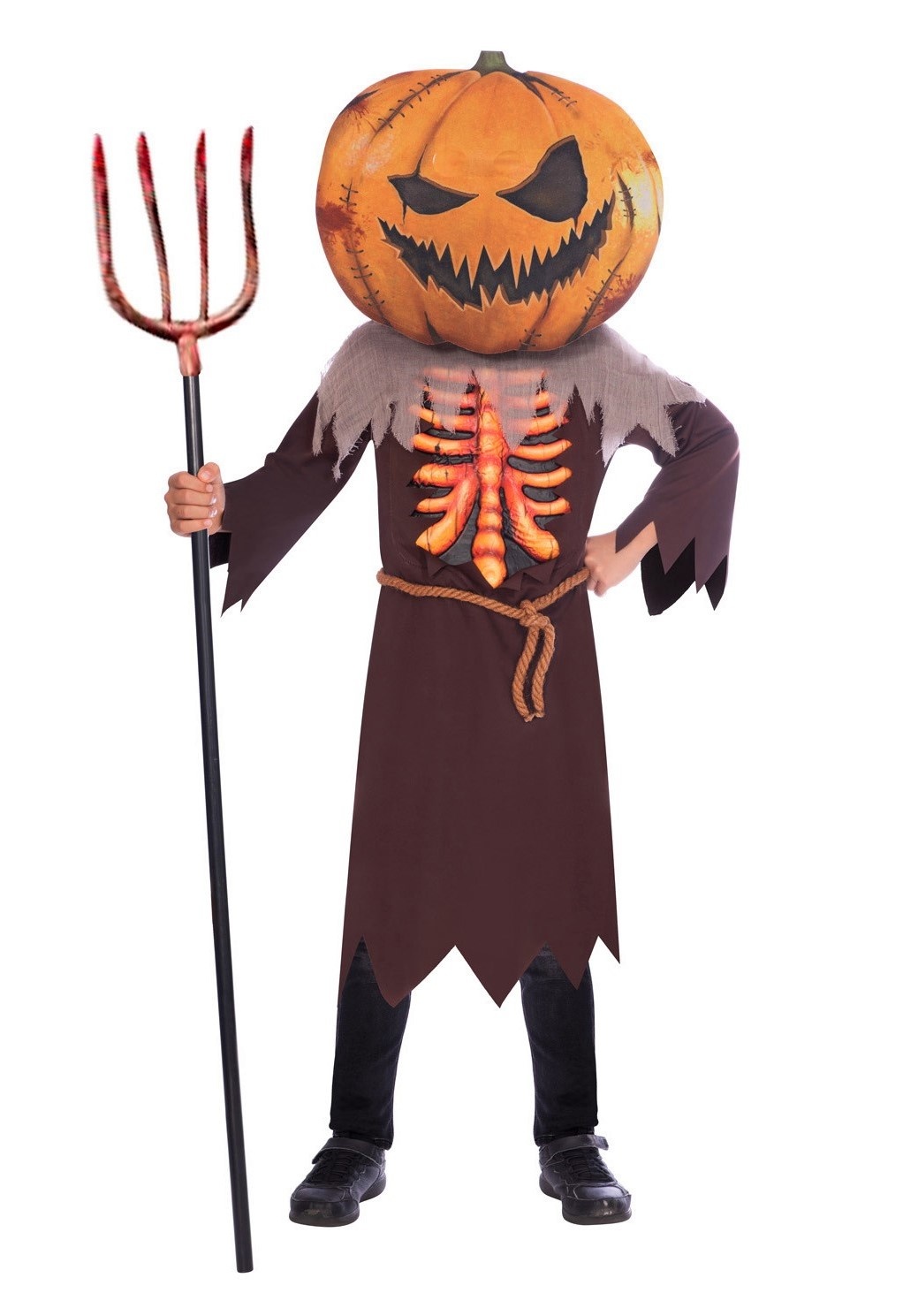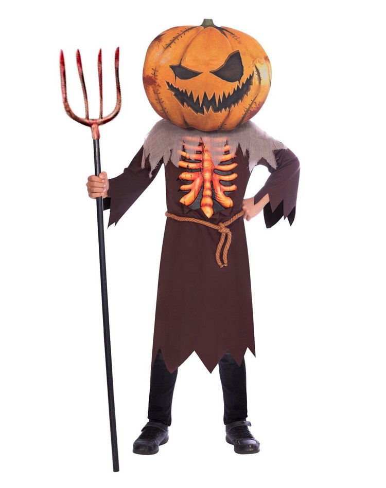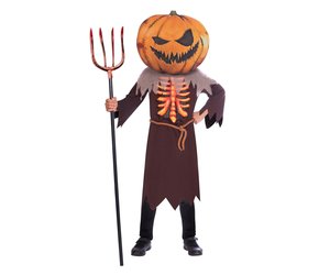 Ein unheimliches Kürbis-Skelettkostüm, mit dem ihr Kind, egal ob Sohn oder Tochter, bestens für Halloween ausgerüstet ist. Das Kostüm ist braun mit aufgedrucktem Skelettprint und einem angedeuteten dekorativen Seilgürtel. Der Schulterbereich ist mit hellbraunem Stoff in Leinenoptik bedeckt. Die Kürbismaske aus Polyester ist sehr leicht, bedeckt das Gesicht vollständig und erlaubt doch gute Sicht durch transparentes Gewebe. Die Verkleidung ist ideal für Kinder, die es gerne etwas gruseliger mögen.