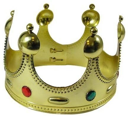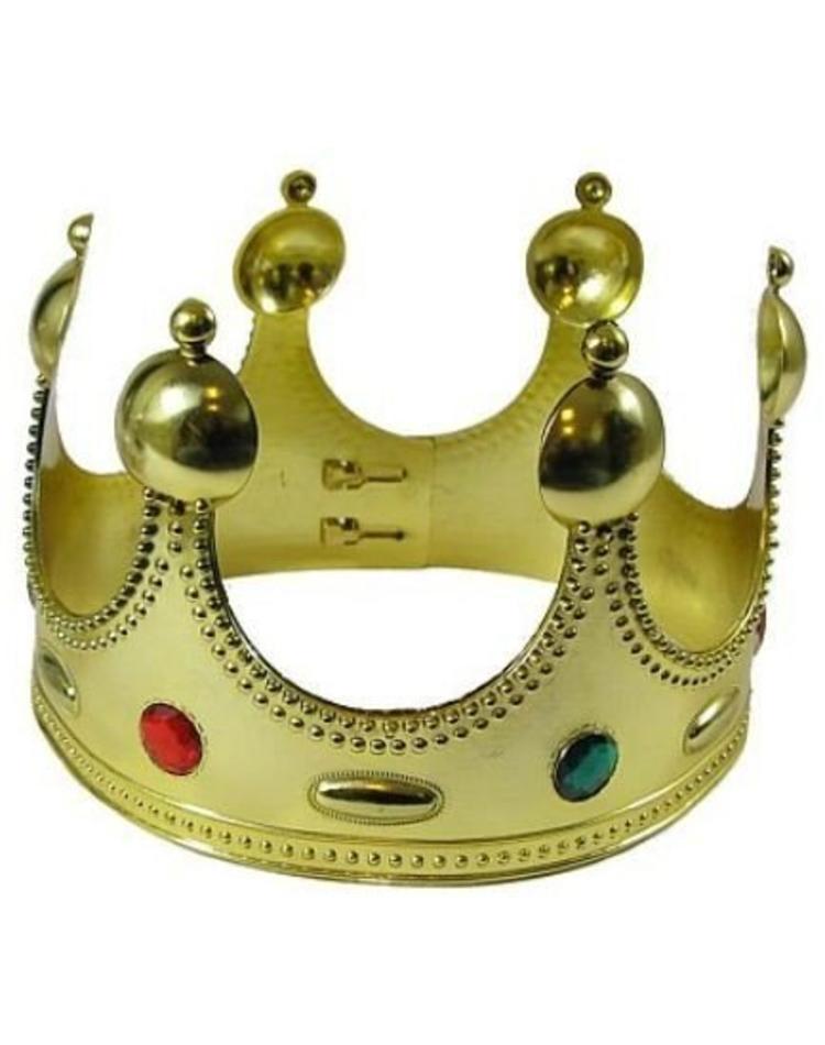 Die Krone für König oder Königin hat goldene Farbe und ist mit bunten Steinen verziert. Die Krone lässt sich mit verstellbaren Schnallen an jede Kopfgröße anpassen.