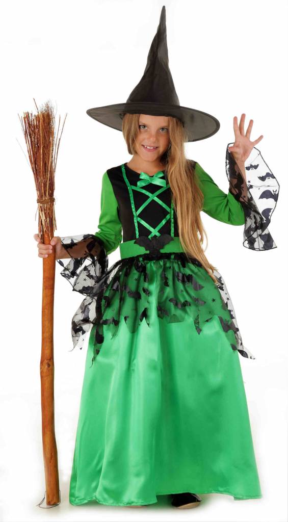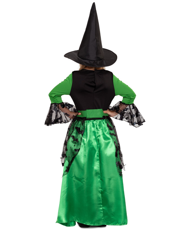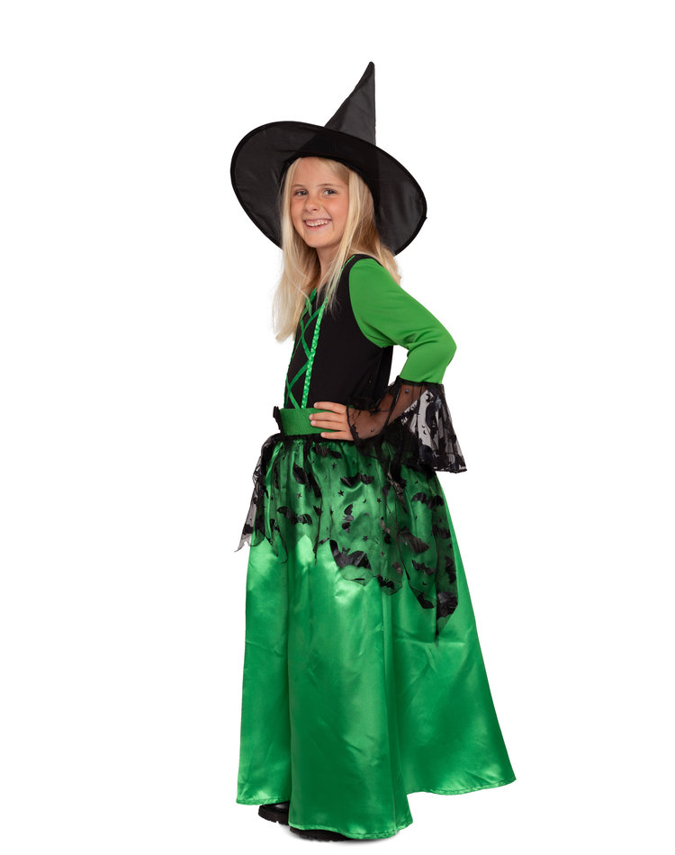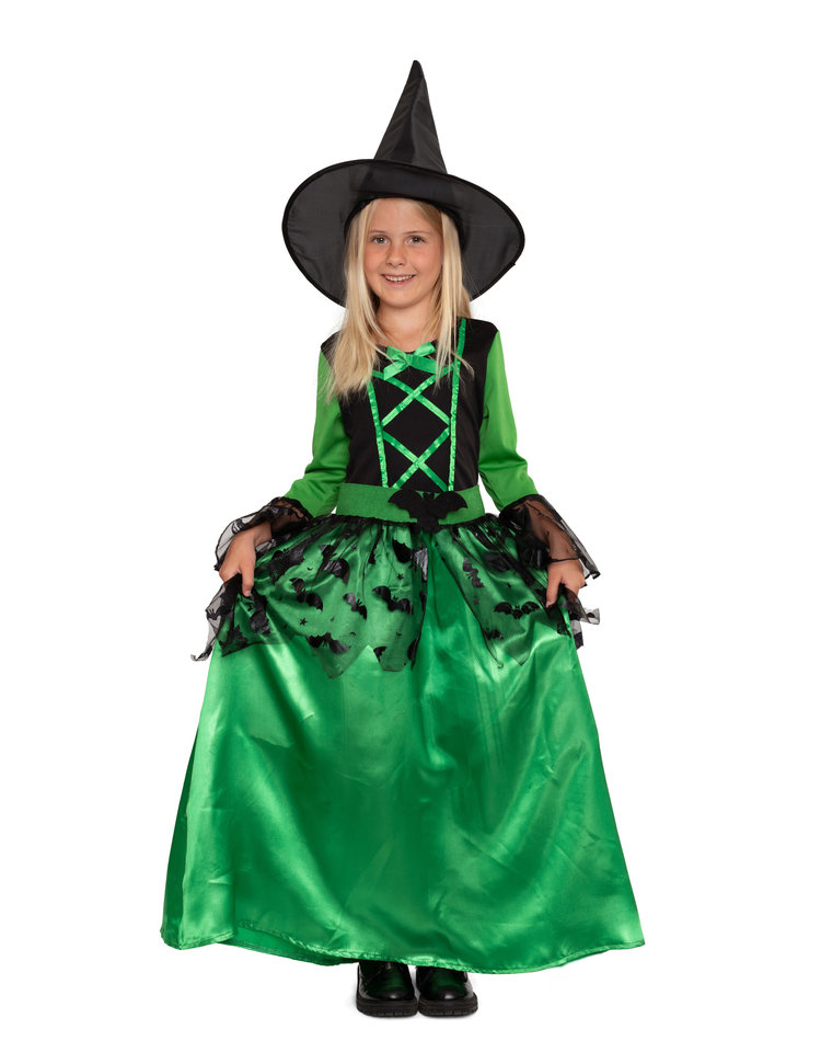 Lieferumfang: Grünes Hexenkostüm für Mädchen inkl. grünes Kleid mit schwarzen Verzierungen im Fledermausmuster und schwarzer Hut (ohne Schuhe und Besen)