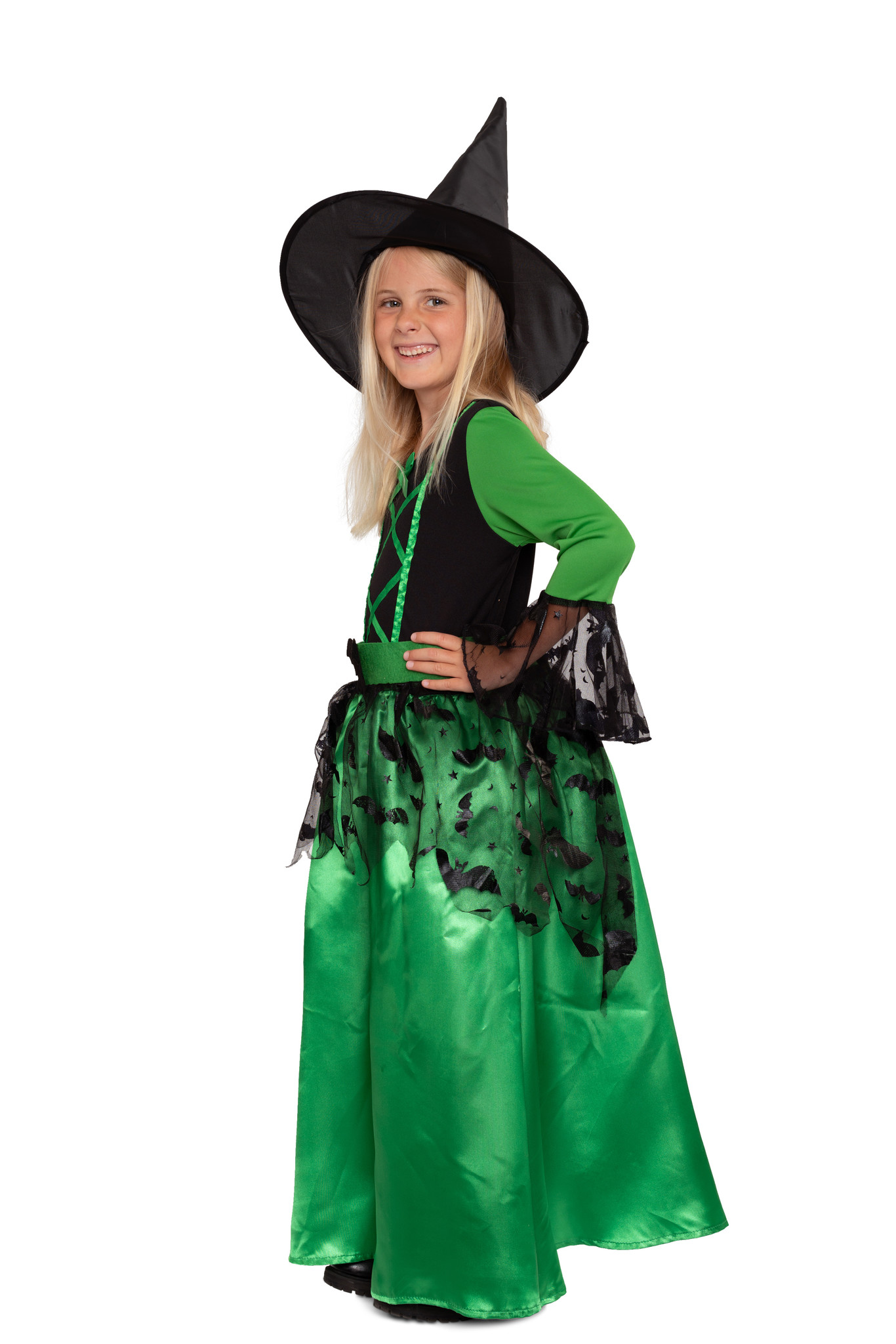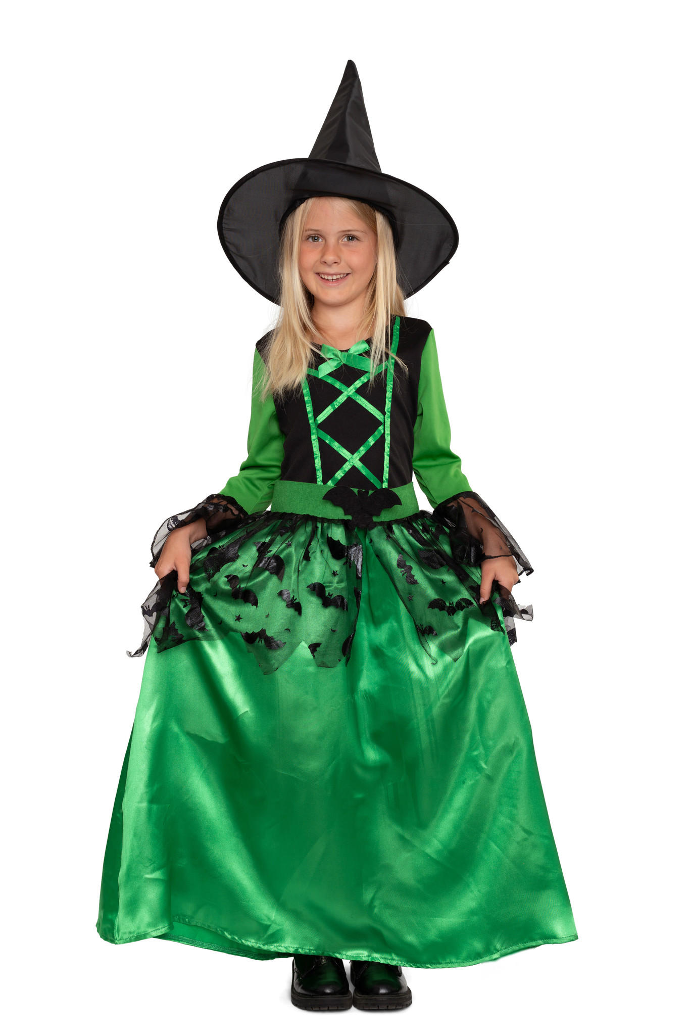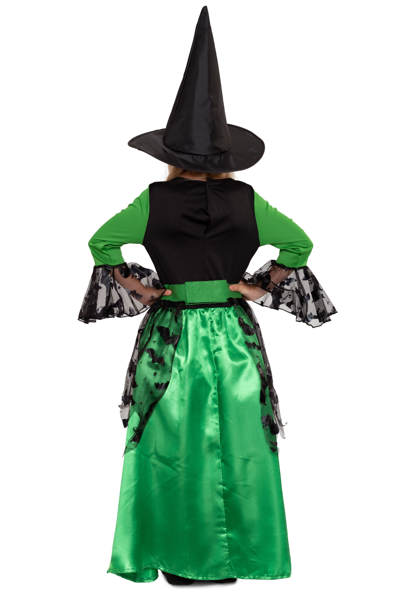Lieferumfang: Grünes Hexenkostüm für Mädchen inkl. grünes Kleid mit schwarzen Verzierungen im Fledermausmuster und schwarzer Hut (ohne Schuhe und Besen)