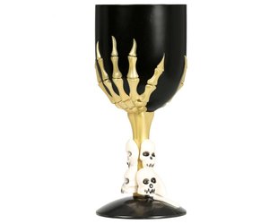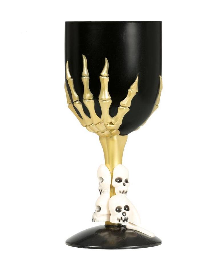 Dieser Kelch ist die perfekte Ergänzung zu jeder Grusel-Partydekoration – und ein echter Hingucker. Fuß und Becherkelch sind schwarz. Der Griff besteht aus einer Skelett-Hand unter der einige weiße Mini-Totenköpfe angebracht sind. Alles in allem ein Klasse-Accessoire aus dem man gut trinken kann.