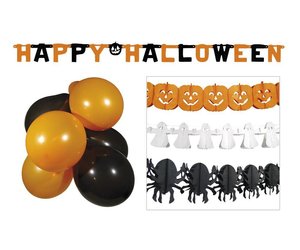 Wir haben ein praktisches Halloween-Set geschnürt. Es enthält je fünf orange und schwarze Luftballons, je eine orange Kürbis-, weiße Geister- und schwarze Spinnen-Girlanden. Dazu kommt noch ein „Happy Halloween“-Schriftzug in Orange und Schwarz. Eine Bestellung für alles….