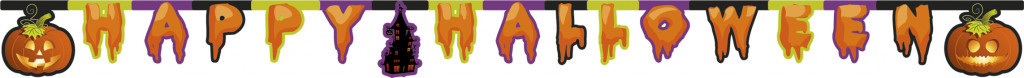 Wer mit wenig Aufwand viel Halloween-Stimmung erzeugen möchte, kann das mit dieser Halloween-Wimpelgirlande. Die Girlande wird außen von zwei Kürbissen eingerahmt. Im mittleren Teil steht in gruselig-verlaufenden Lettern „Happy Halloween“. Zwischen „Happy“ und „Halloween“ ist dabei ein schwarzes Gruselschloss. Die Befestigung oben an der Girlande ist in den passenden Farben gehalten.
