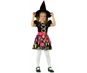 Das Kostüm Hexe besteht aus zwei Teilen: Da ist zum einen der schwarze, spitze Hexenhut, der am unteren Rand mit einem bunten Band verziert ist. Zum anderen ist da das wirklich schöne Hexenkleid. Es ist in der Grundfarbe Schwarz, hat aber etliche Farb-Elemente, die es zum absoluten Hingucker machen. Das fängt beim pinken Hüftgürtel an, geht bei den vielen bunten Punkten auf dem Rock-Teil weiter und setzt sich bei den verspielten bunten Schnüren im Oberteil fort. Am Ende entsteht so ein Kinderkostüm, dass nicht nur zu Halloween passt, sondern auch zu Fasching und anderen Kostümpartys.