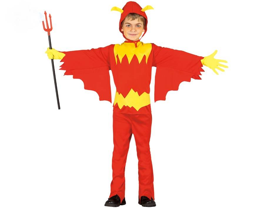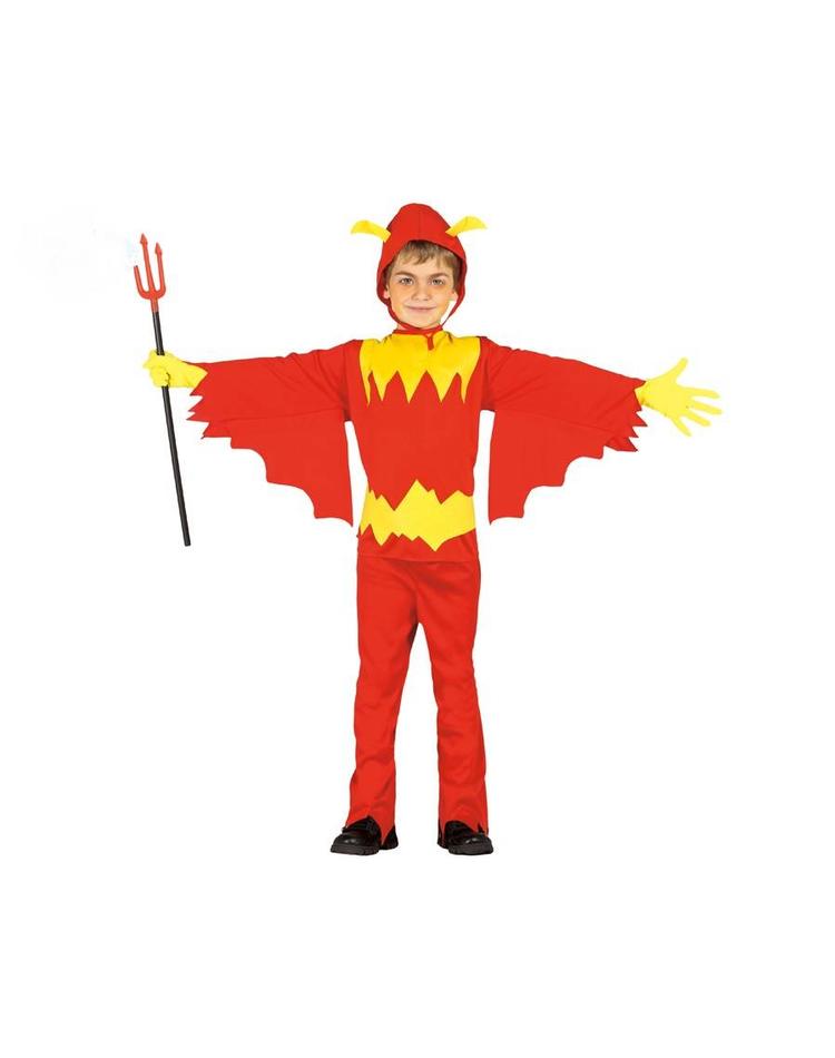 Zum Teufel mit diesem Kostüm? Nein, ganz und gar nicht! Unser Kinderkostüm Teufel ist modisch geschnitten und sieht wirklich cool aus! Dazu gehören die rote Hose, das gelb-rote Oberteil mit Zackenmuster auf der Brust und die weiten flügelartigen Ärmel sowie die rote Kopfbedeckung mit den zwei gelben Teufelshörnchen. Ein Teufel-Kostüm, das durch gelbe Handschuhe und einen Plastik-Teufelsdreizack (nicht in der Lieferung enthalten) perfektioniert wird.