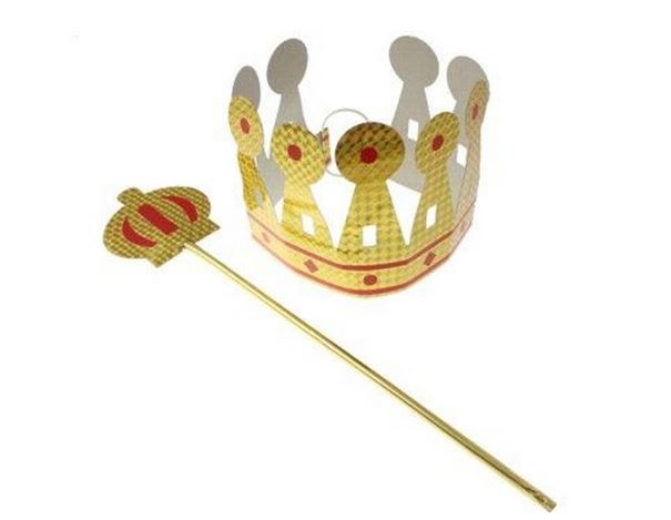 Der König-Set für Kinder umfasst eine Krone und Zepter aus Papier in goldener Farbe.