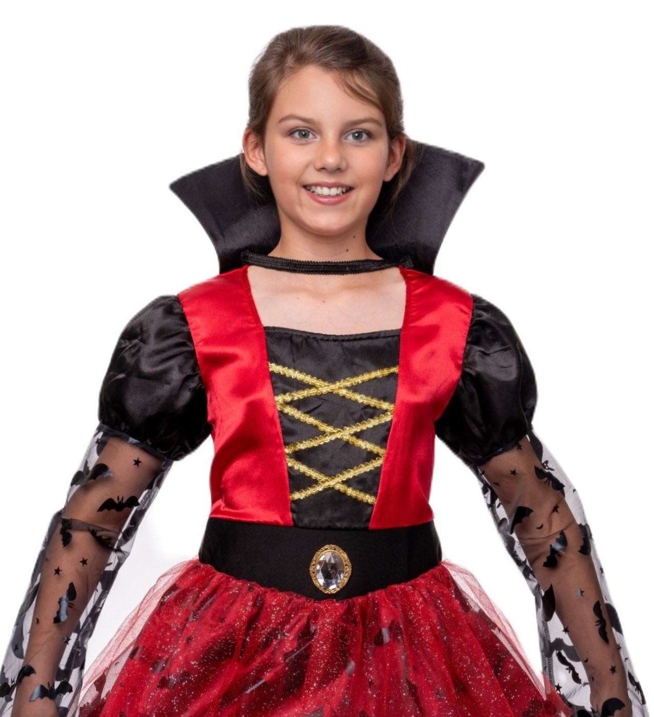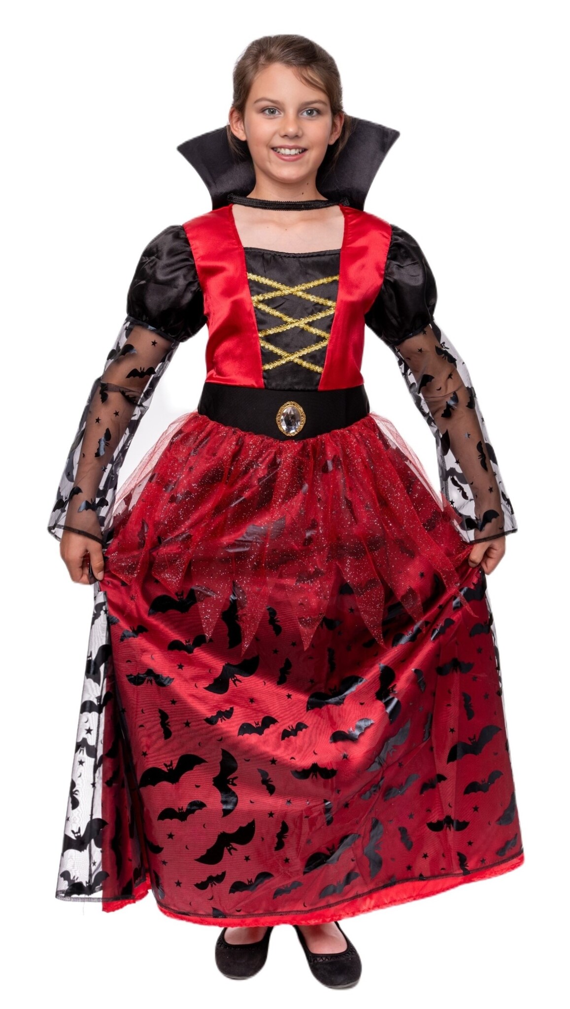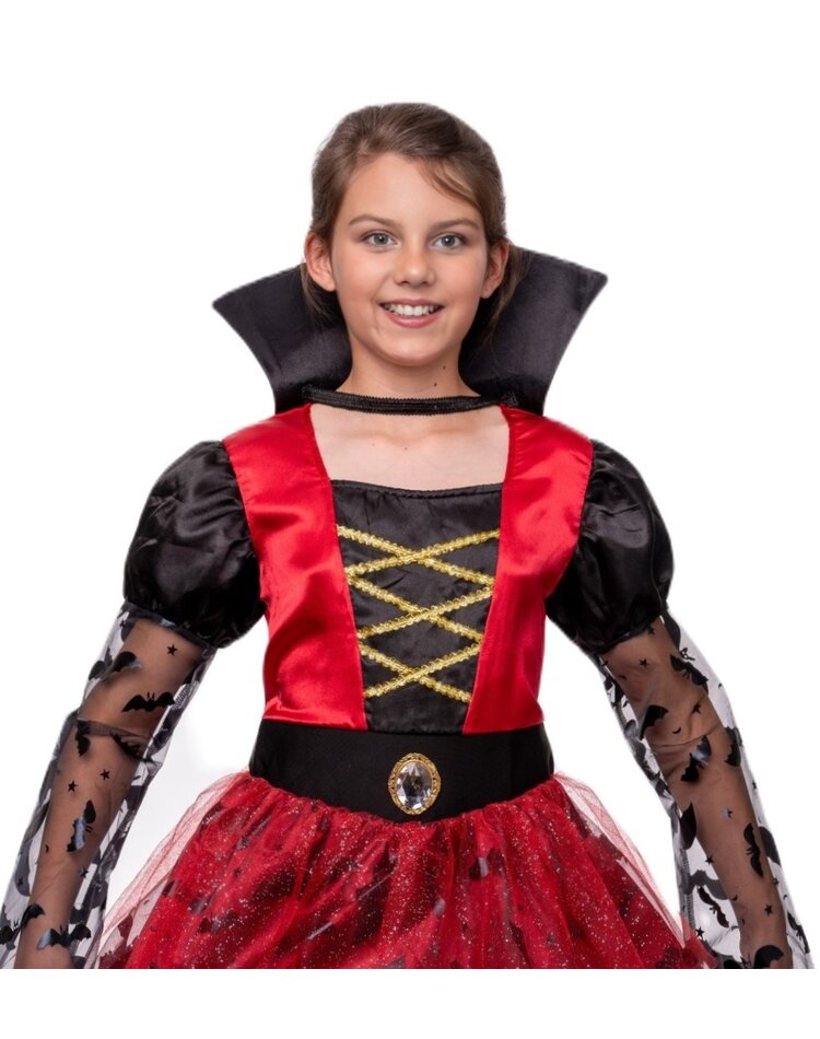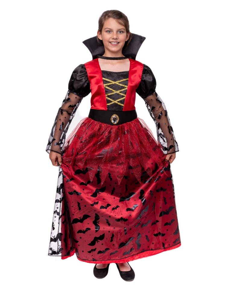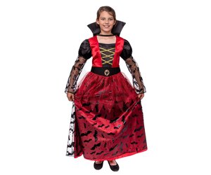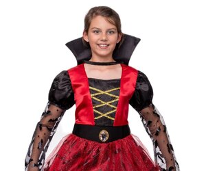 - Vampir Kostüm für Mädchen: Das leuchtend rote Oberteil mit goldener Schnürung verleiht einen edlen Look, die Puffärmel und der Rock mit Fledermaus-Details sorgen für das typische Vampir-Flair.