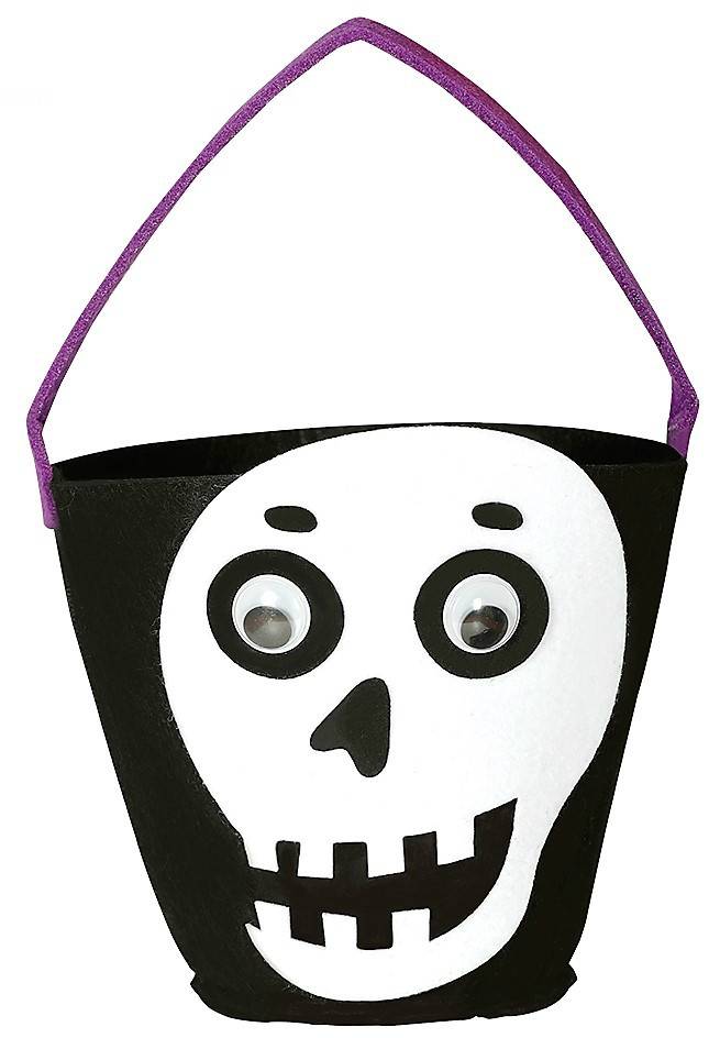 Dieses Halloween-Accessoire ist definitiv ein Hingucker. Der ausgefallene Korb aus Filz (22 cm lang) in Schwarz und Weiß ist mit Skelett-Kopf bedruckt. Die Tasche eignet sich perfekt zum Sammeln von Süßigkeiten und zum Verschenken kleiner Halloween-Überraschungen.