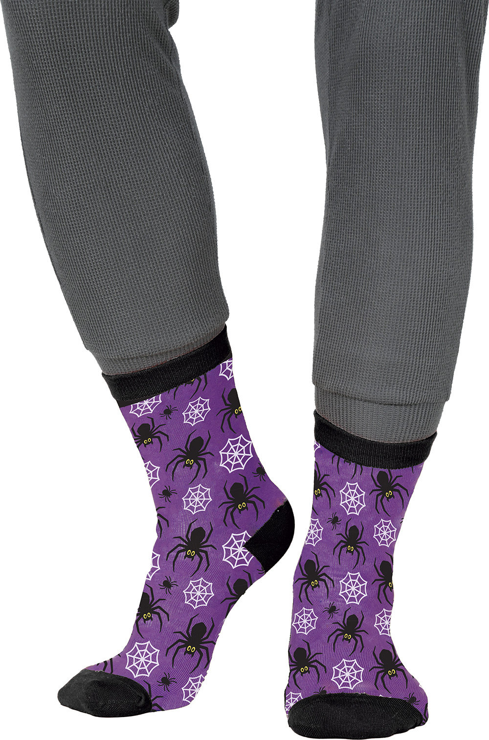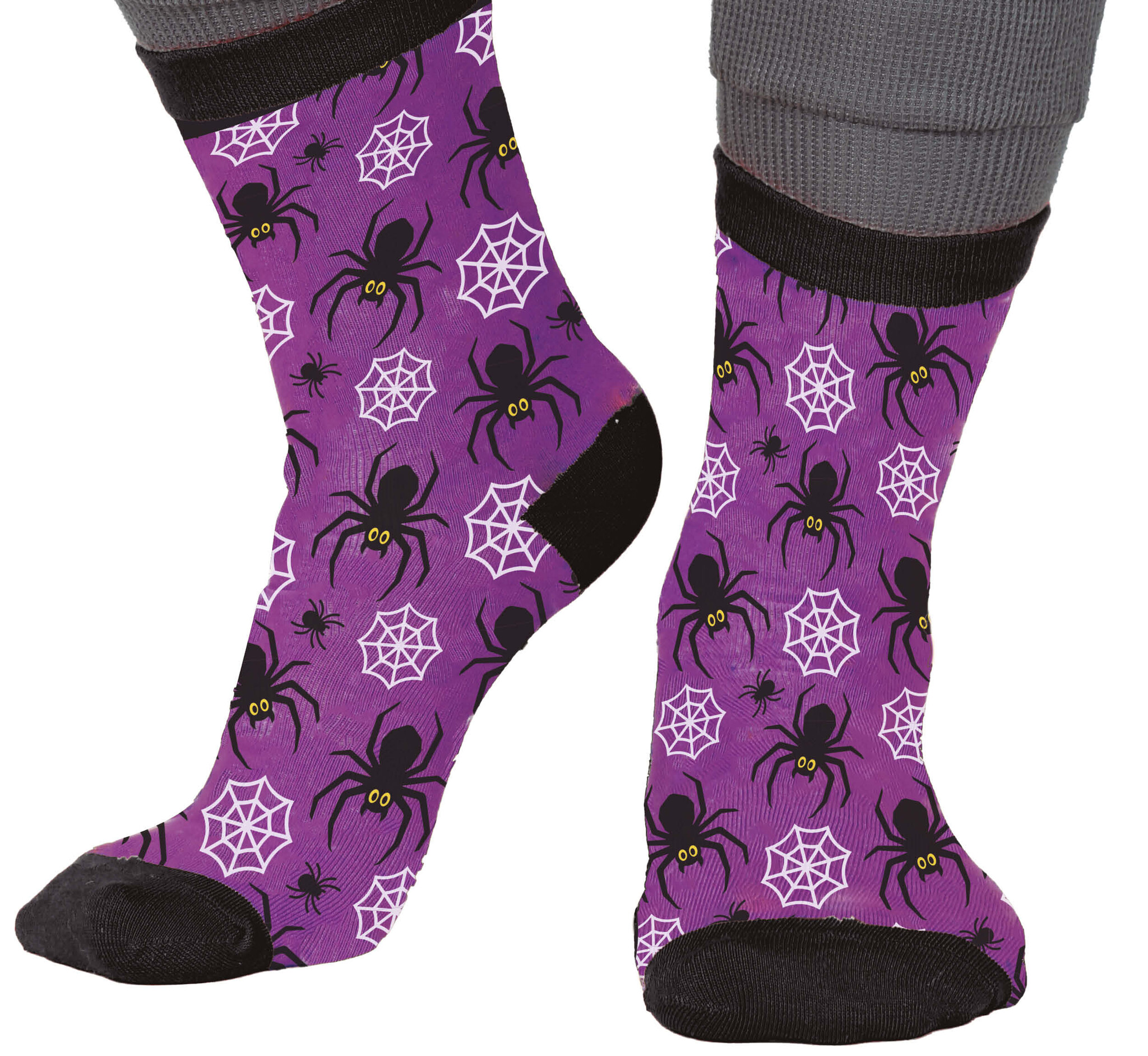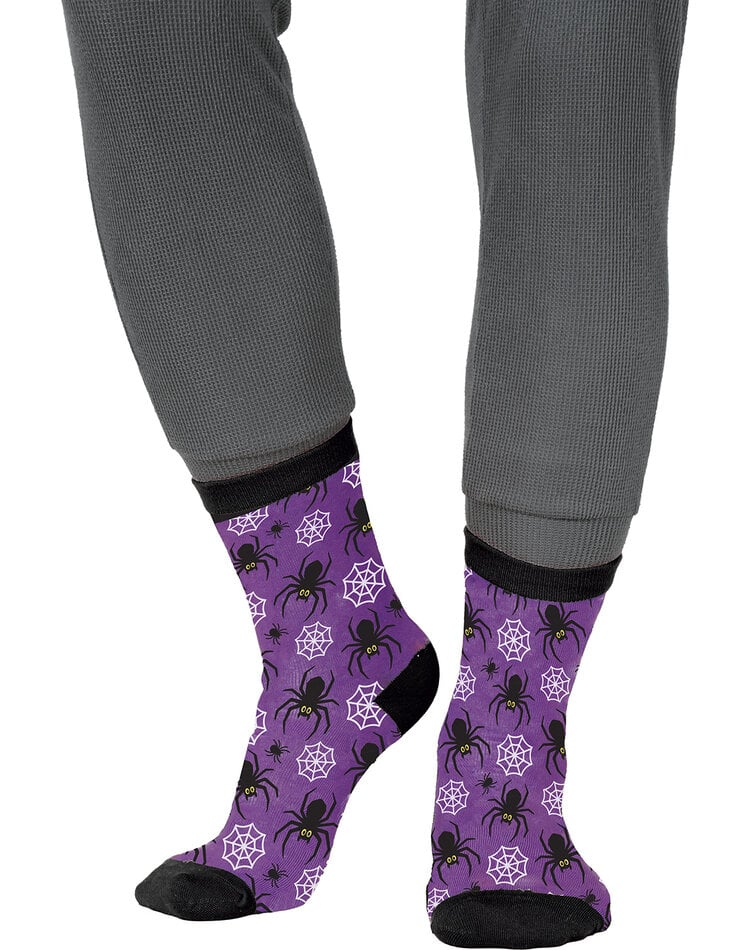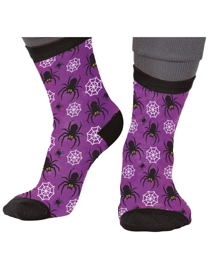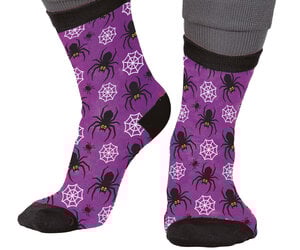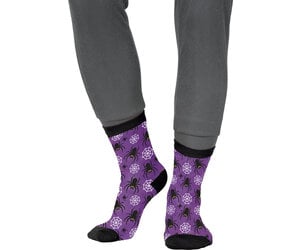 Die Socken sind in einem leuchtenden Lila gehalten und mit einem Muster aus großen und kleinen schwarzen Spinnen sowie weißen Spinnweben bedruckt. Sie bringen Farbe in jedes Halloween-Outfit.