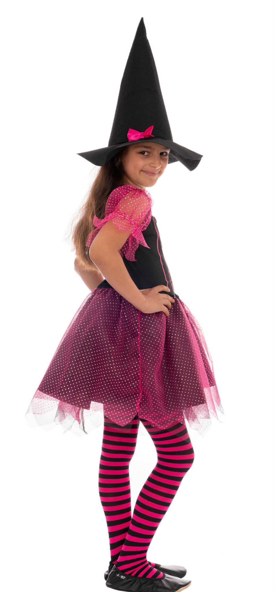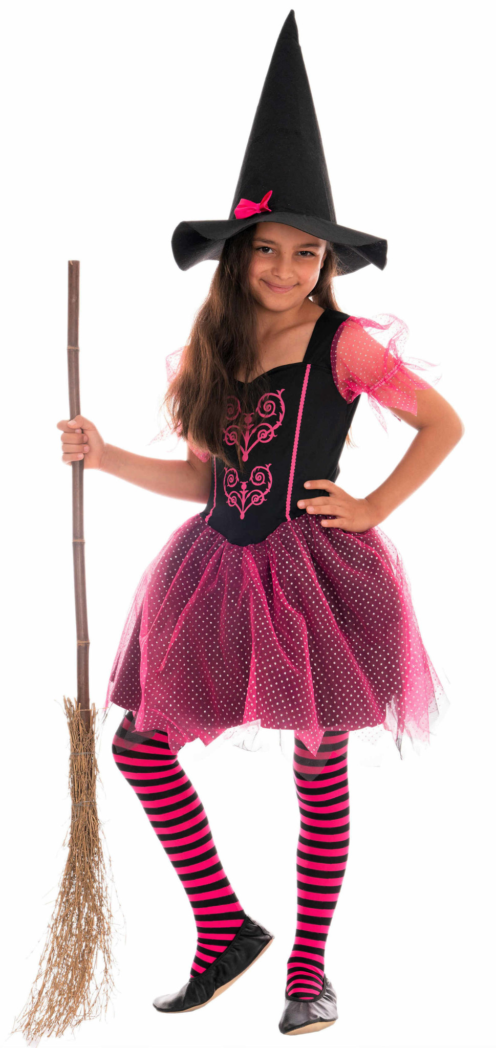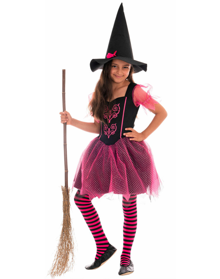 Märchenhafter Tanz – Ein kurzes einteiliges Hexenkleid mit schicken Details in schwarz und Pink. Mit diesem Kostüm verwandelt sich jedes Mädchen an Halloween in eine bezaubernde Hexe und an Fasching in eine Prima-Ballerina. Dank der Knielänge kann ihr Kind sicher tanzen und spielen. Der Kleiderrock besteht aus mehreren Schichten und formt ein süßes Tutu. Pinke Rankenmuster in Herzform verzieren das schwarze Oberteil und bilden einen schönen farblichen Kontrast. Ein echtes Highlight ist der pinke Tüll mit kleinen silber-glitzernden Punkten an Rock und Ärmeln.