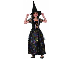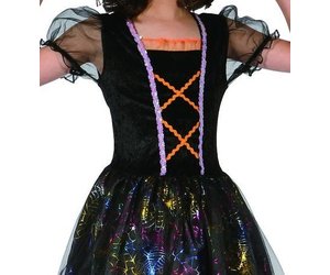 Dieses Hexenkostüm für Kinder ist wirklich ein Hingucker. Es besteht aus einem eleganten schwarzen Kleid, das vor allem im Rockbereich durch ein Klasse-Design begeistert. Hier sind Spinnenweben und weitere "Grusel-Elemente" in glänzenden Neon-Farben aufgebracht, im oberen Teil verziert durchsichtiger schwarzer Netzstoff den Hüftbereich. Der obere Teil des Kleids besticht derweil durch schlichte Eleganz. Glänzender schwarzer Stoff wird durch die orangen Bänder im mittleren Teil betont. Die Schulter-Partien werden durch durchsichtigen schwarzen Netzstoff (wie im Hüftbereich) in Szene gesetzt. Der Clou ist dann noch der spitze schwarze Hexenhut, der das Hexenkostüm perfekt macht.