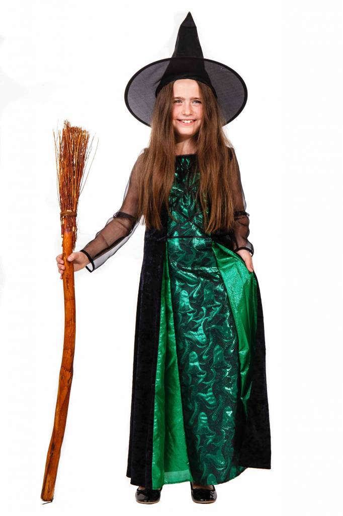 Elegantes hochwertiges Hexenkostüm für Mädchen in Schwarz-Grün aus Velours und Organza.