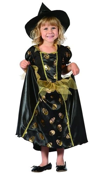 Dieses schicke Halloween Hexenkostüm Kleinkind Größe 92-104 gold-schwarz gold-schwarz mit goldenen Totenkopf-Applikationen umfasst ein langes Kleid und einen passenden Hut.