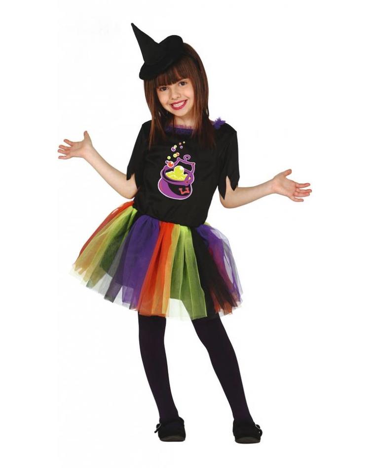 Gute Laune ist mit diesem herrlich bunten Kostüm Hexe für Kind vorprogrammiert. Ob als Hexe oder Zauberin – der lustig blubbernde Kessel auf dem feschen Oberteil entzückt Groß und Klein. Wie es sich für echte Hexen gehört, hat dieses Kostüm Hexe für Kinder lustige Zipfel am Ärmel und einen schönen Kragen in lila Tüll. Das absolute Highlight ist jedoch der Rock aus vielen bunten Tüllteilen, die zu einem wundervollen Regenbogen aufwändig zusammengenäht wurden. Als Sichtschutz befindet sich unter dem Tüllröckchen noch ein schwarzer, etwas kürzerer, blickdichter Unterrock. Jetzt fehlt unserer Zauberhexe nur noch ein Hut und die Party kann beginnen. Der kleine Spitzhut passt gut auf jeden hübschen Mädchenkopf und lässt noch ausreichend Platz für wilde Frisurkreationen oder wer mag auch Farben. So schön wie der Rock wird aber höchstens noch die kleine Hexe selbst strahlen!