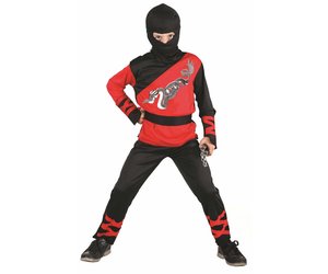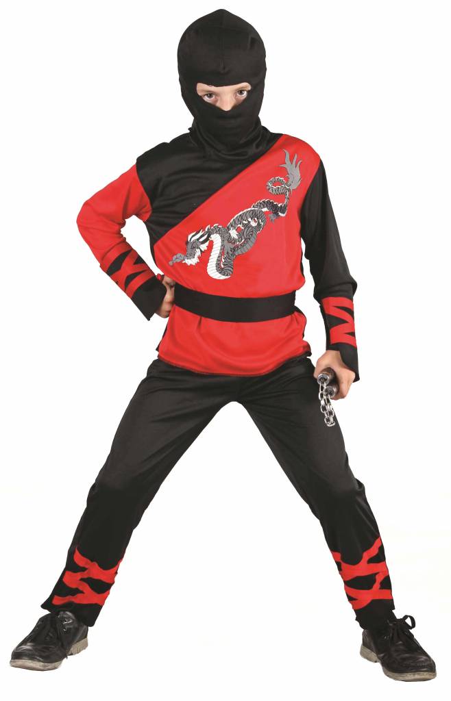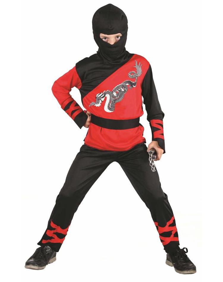 Lieferumfang: Ninja-Kostüm "Dragon" für Kinder bestehend aus einen rot-schwarzen Oberteil mit Drachen-Print, einer schwarzen Hose, einem Gürtel und einer schwarzen Ninja-Maske.