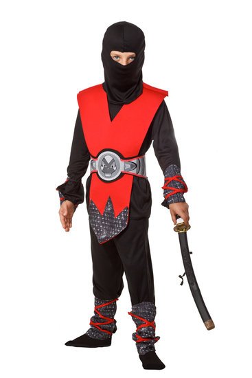 Lieferumfang: Ninja Kostüm Kinder schwarz-rot (inkl. schwarze Hose, Bluse & Kopfbedeckung, Rüstung in roter Farbe mit schwarz-weißen Applikationen, dazu passender Gürtel, Armstulpen & Beinstulpen).