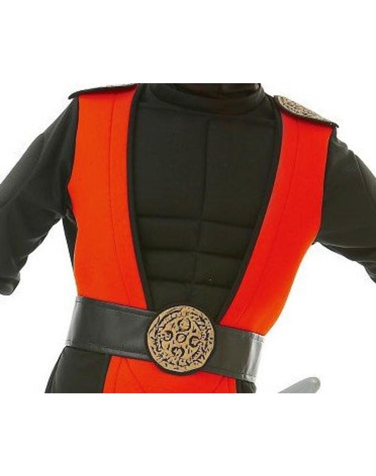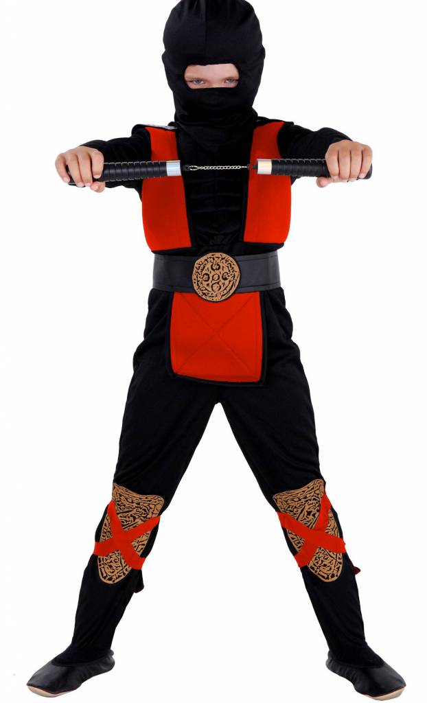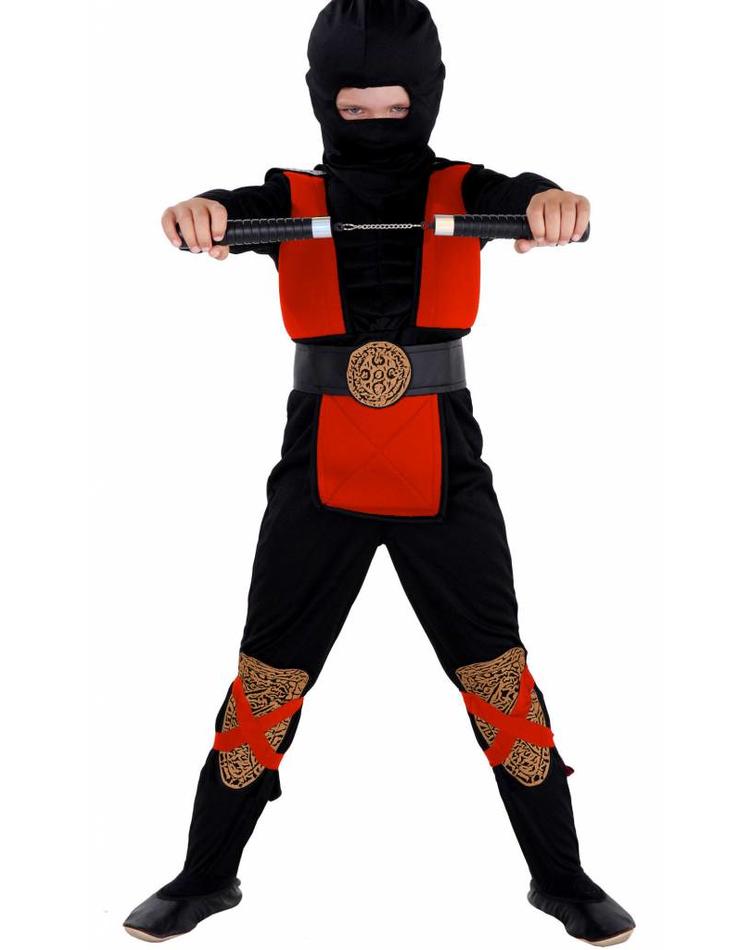 Der Ganzkörperanzug in Schwarz hat rote Elemente an den Knien und Handgelenken, dazu einen roten Schutz am Oberkörper und Verzierungen am Gürtel, Armen und Beinen im Kupfer-Look. Das gepolsterte Oberteil mit angedeuteten Muskeln macht jeden Jungen zum wahren Superhelden. Zu dem Kinderkostüm Ninja gehört auch noch das Kopfteil mit der Maske. Greifen Sie zu und bekommen mit nur einer Bestellung das komplette Ninja-Verkleidung für Ihren kleinen Kämpfer - oder Ihre kleine Kämpferin.
