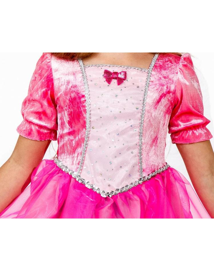 Das edle Prinzessinkleid von Magicoo vesteht aus einem rosafarbenen Unterrock und einem Überrock aus durchscheinenden, pinken Stoff. Das Oberteil des Kleides ist ebenfalls in Pink- und Rosatönen gehalten. Im Brust- und Bauchbereich sind glitzernde Pailetten aufgenäht. Die kurzen Kleidärmel sind leicht gepufft und enden knapp über dem Ellenbogen. Auf dem Oberteil ist außerdem eine kleine, pinke Schleife angebracht. Bei einer richtigen Prinzessin darf das Diadem natürlich nicht fehlen. Dieses ist nicht im Lieferumfang enthalten, kann aber zusätzlich im Magicoo Kostüme Online Shop bestellt werden. Zu dem bodenlangen Prinzessin Kostüm trägt man am besten Ballerinas in Weiß oder Rosa.