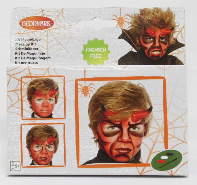 Dieses Schminkset Teufel/Teufelin für Halloween beinhaltet eine Palette mit drei Farben und einen Applikator. Das Make-up lässt sich mit Wasser und Seife wieder abwaschen.