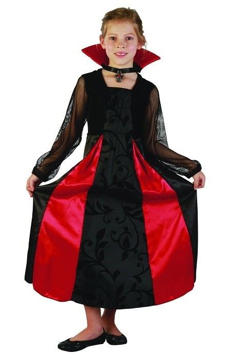 Das Vampirin-Dracula Kostüm für Mädchen umfasst ein schwarz-rotes langes Kleid und einen Kragen mit Anhänger. Das Vampirkostüm für Mädchen ist verfügbar für Kinder in Größen 110-116, 122-128, 134-140.