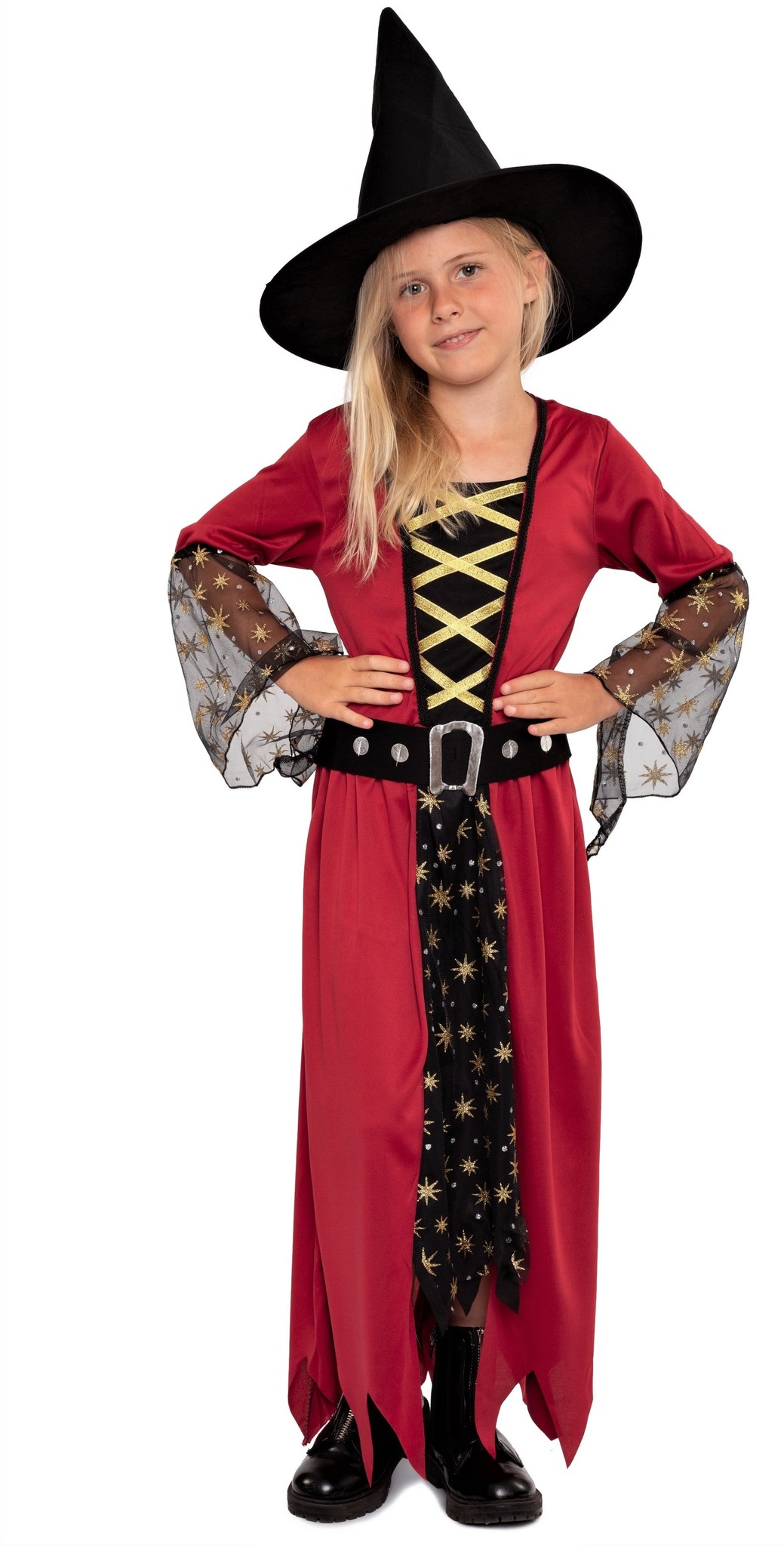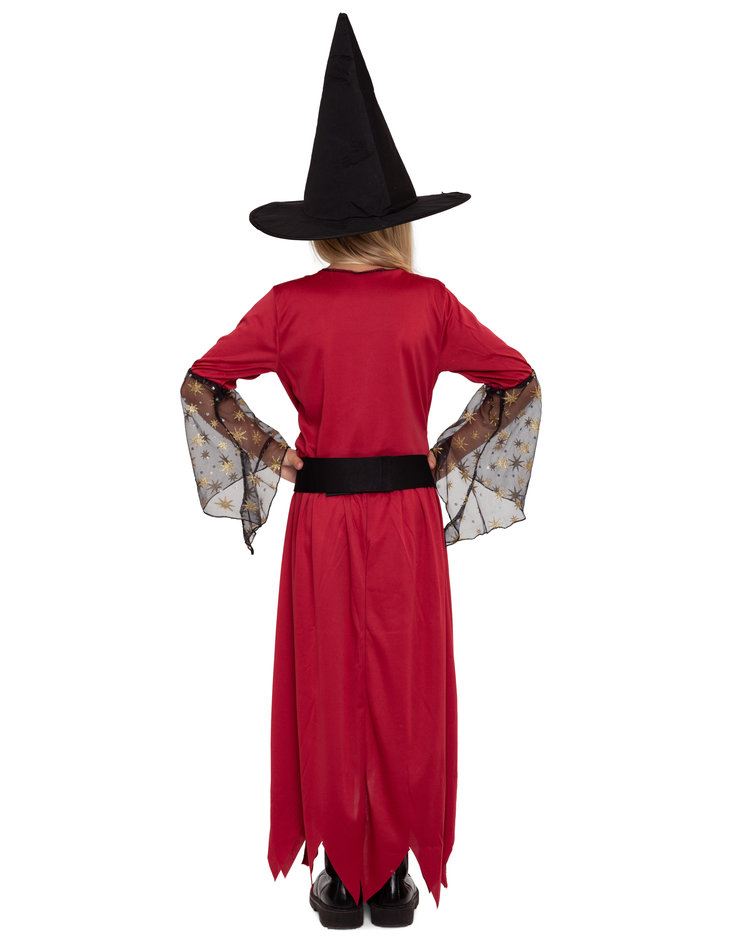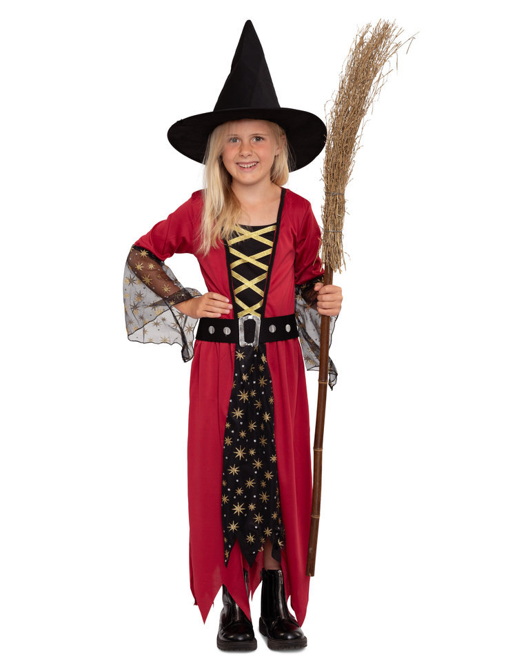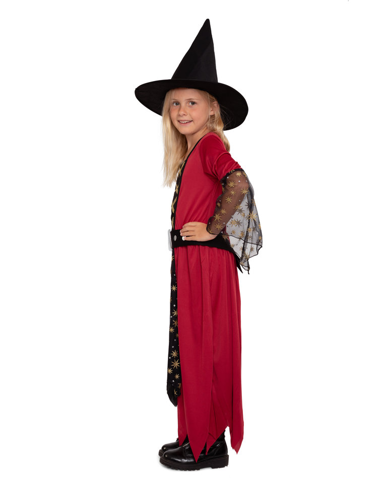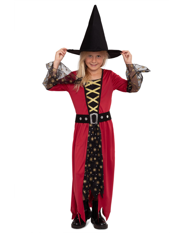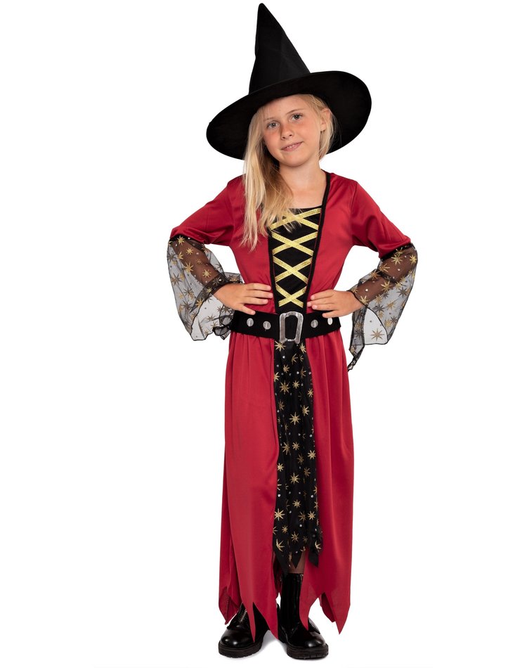 Mit Sternenstaub & Hexenkraut ! Dieses zauberhafte Hexenkostüm besteht aus einem einteiligen, langen Hexenkleid in den Farben Rot und Schwarz mit goldenen Details und einem schwarzen Hut. Das Kleid weist das Design eines Umhangs mit integriertem Unterkleid auf und trägt am Unterrock und den Trompetenärmeln eine Schicht aus schwarzem Tüll, welcher mit kleinen goldenen Sternen geschmückt ist. Das Oberteil des Kleides ist mit goldenem Satinband in Schnüroptik verziert, der Kleiderrock endet in trendigen Zickzack Fransen und ein passender Gürtel mit glänzender Schnalle rundet das Kostüm ab. Der Hexenhut bleibt formstabil auf dem Kopf sitzen.
