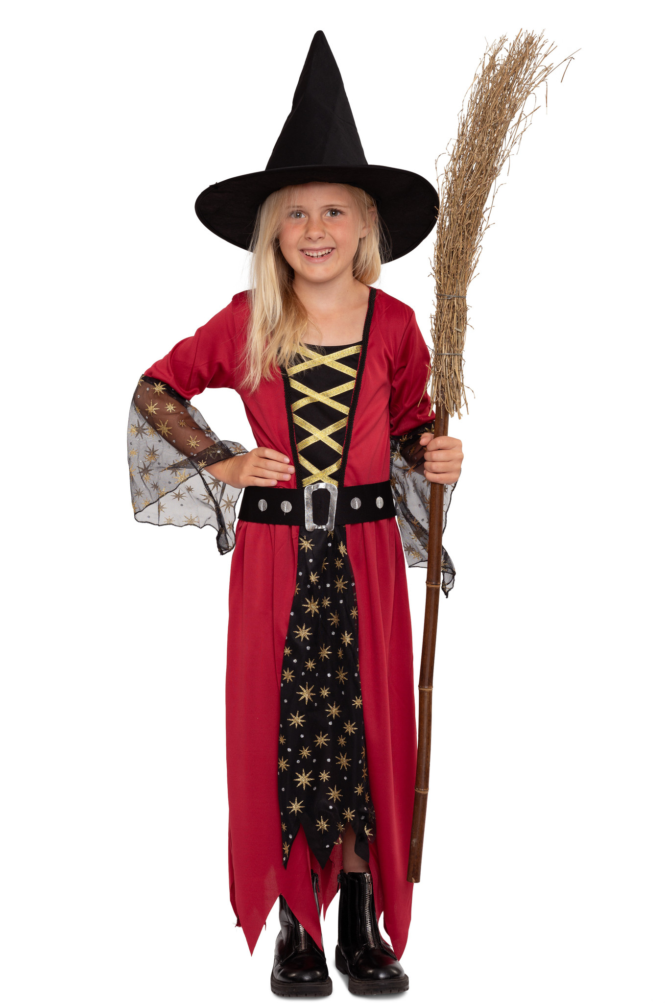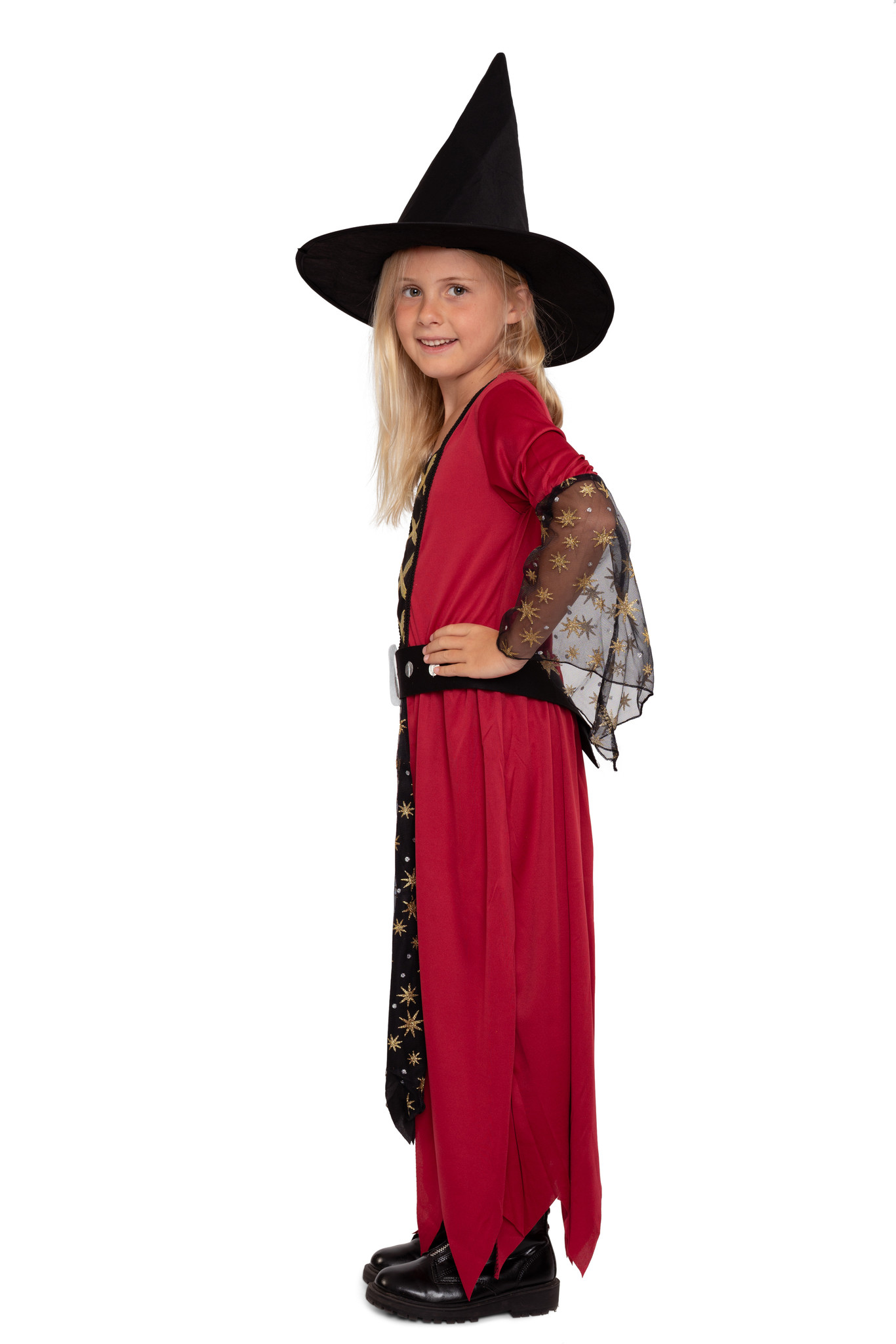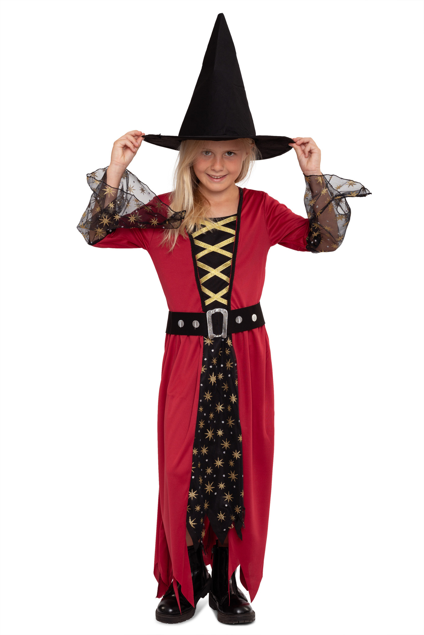 Mit Sternenstaub & Hexenkraut ! Dieses zauberhafte Hexenkostüm besteht aus einem einteiligen, langen Hexenkleid in den Farben Rot und Schwarz mit goldenen Details und einem schwarzen Hut. Das Kleid weist das Design eines Umhangs mit integriertem Unterkleid auf und trägt am Unterrock und den Trompetenärmeln eine Schicht aus schwarzem Tüll, welcher mit kleinen goldenen Sternen geschmückt ist. Das Oberteil des Kleides ist mit goldenem Satinband in Schnüroptik verziert, der Kleiderrock endet in trendigen Zickzack Fransen und ein passender Gürtel mit glänzender Schnalle rundet das Kostüm ab. Der Hexenhut bleibt formstabil auf dem Kopf sitzen.
