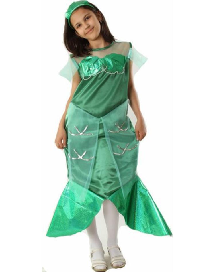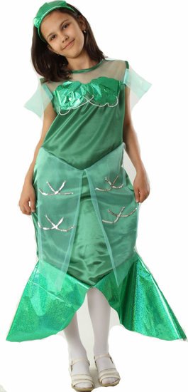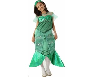 Die kleine Meerjungfrau ist seit Jahren eines der beliebtesten Kostüme bei kleinen Mädchen - und das ist kein Wunder. Schauen Sie sich nur dieses Meerjungfrau Kostüm für Kinder an! Das meergrüne Kleid hat die typische Flossenform an den Beiden und gleicht auch sonst von der Form einer Meerjungfrau. Als Verzierung ist das Kostüm mit durchsichtigen helltürkisenen Netzen benäht, auf denen mit silbernen Pailletten wellenähnliche Muster aufgestickt sind. Diese Netze finden sich auch im Schulter und Brustbereich wieder, so dass das Meerjungfrau Kostüm für Kinder ein rundes Bild ergibt. Die Kopfbedeckung in dunklem Meeresgrün rundet das Bild perfekt ab.