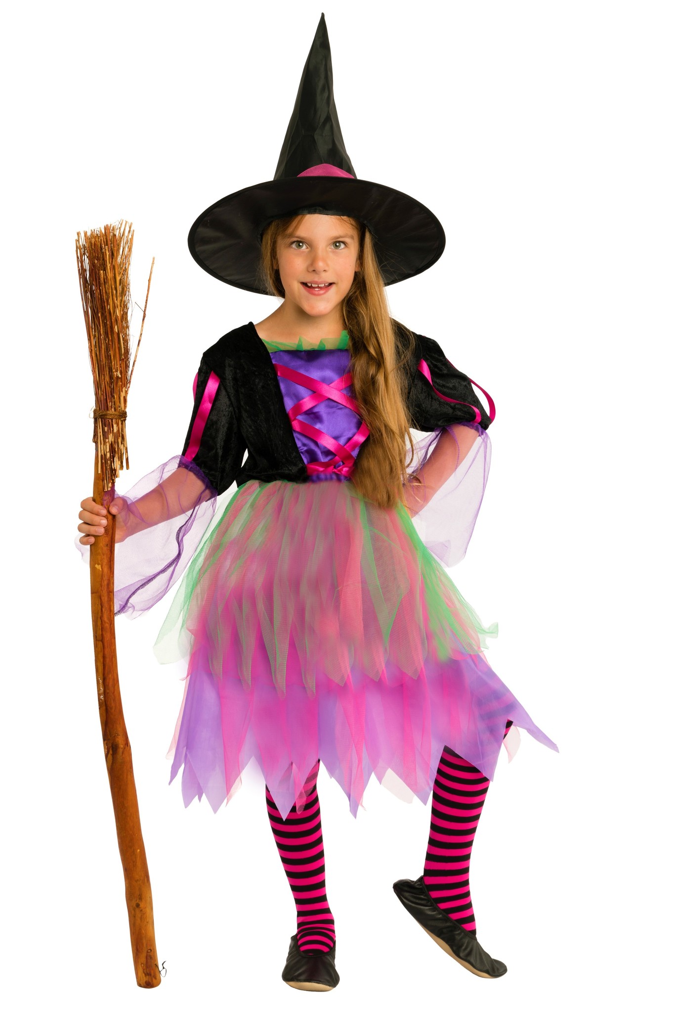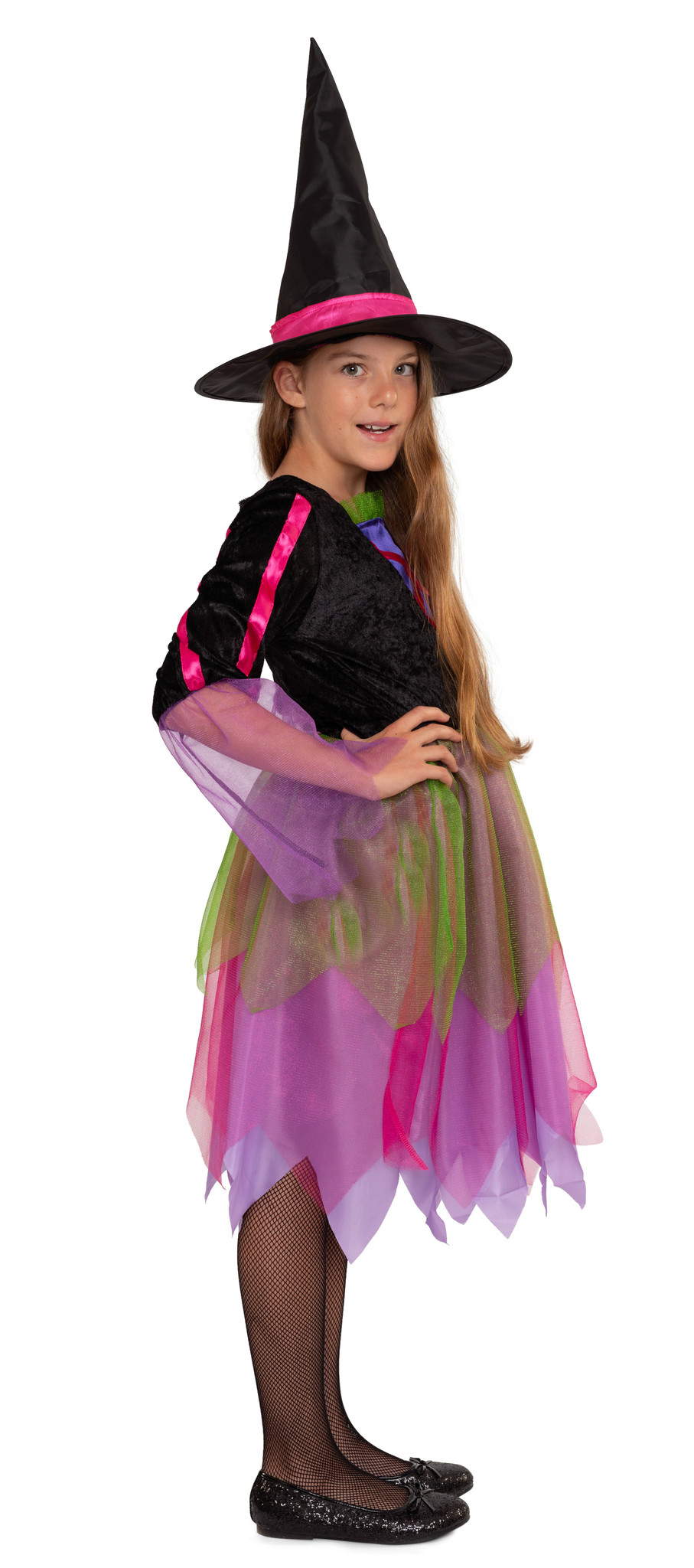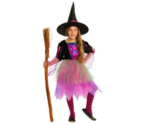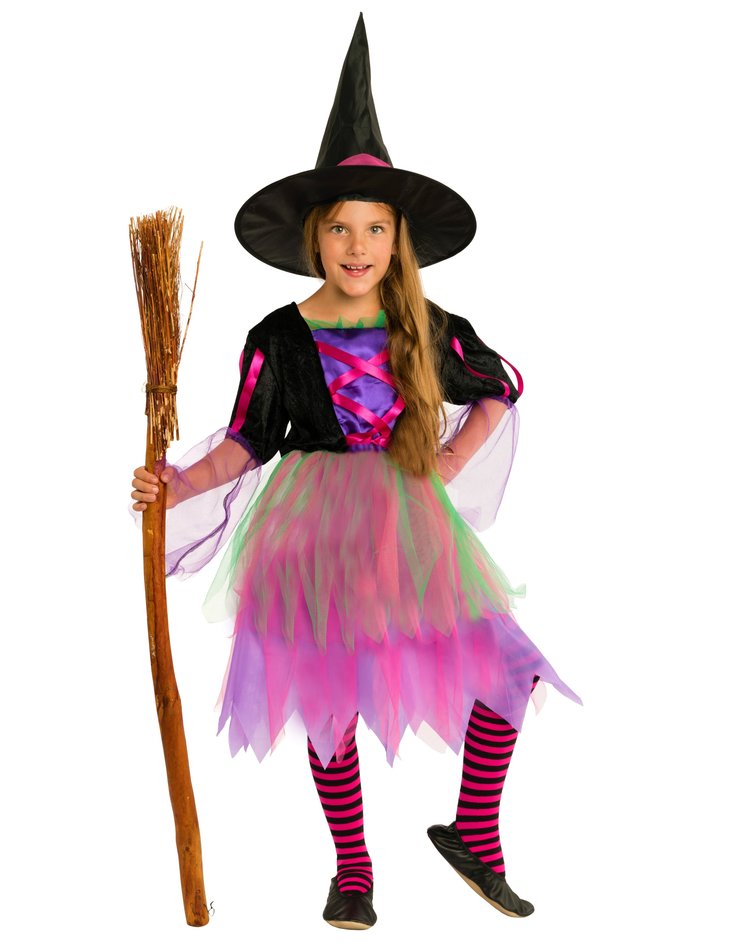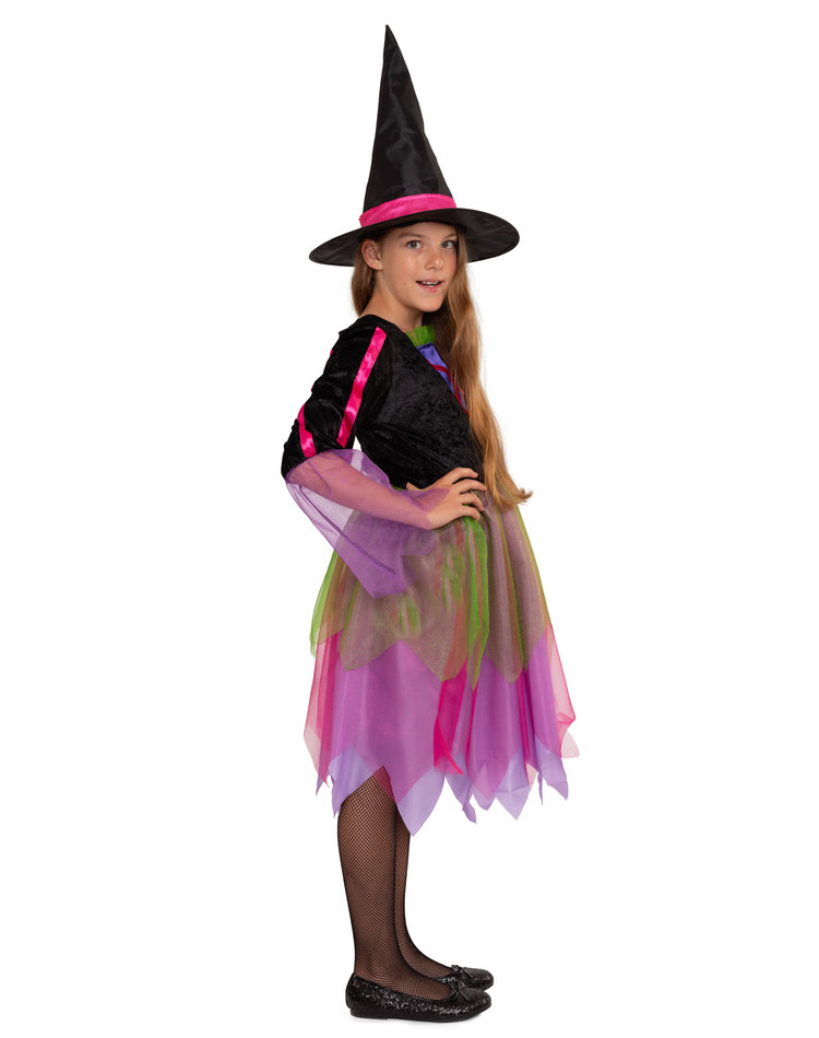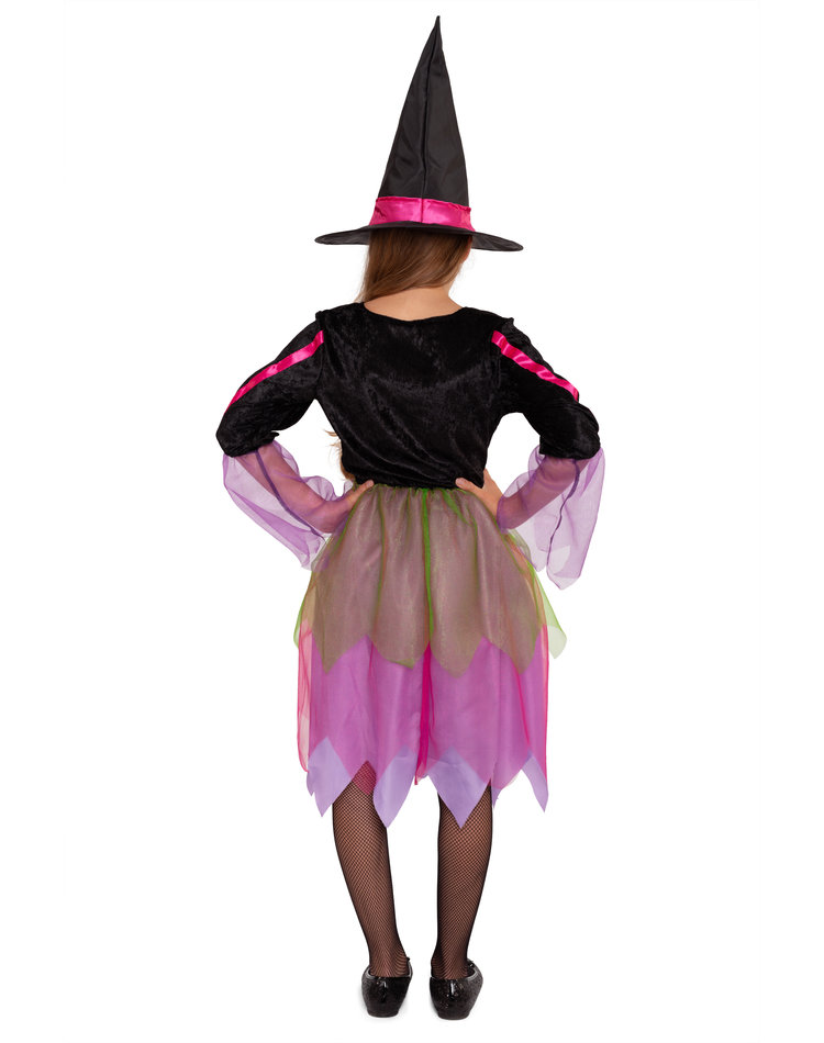 Kunterbunte Hexenwelt – Diese märchenhafte Verkleidung besticht mit strahlenden, bunten Neonfarben. In diesem Kostüm verhext ihre Tochter nicht nur an Halloween die bösen Geister, sondern verzaubert auch an Karneval oder Fasching jedes Fest. Das knielange Hexenkleid hat einen Kleiderrock aus mehreren Schichten mit leuchtenden Violett, Rosa und grünem Tüll, die dem Kleid ein schönes Volumen verleihen. Die trendigen Fransen am Rockende peppen das Kostüm zusätzlich auf. Das Oberteil besteht aus einem schwarzen, samtigen Material und einem seidig lilafarbenen Stoff in Westenoptik. Pinke Satin-Bänder schmücken das Oberteil und den schicken schwarzen Hexenhut.