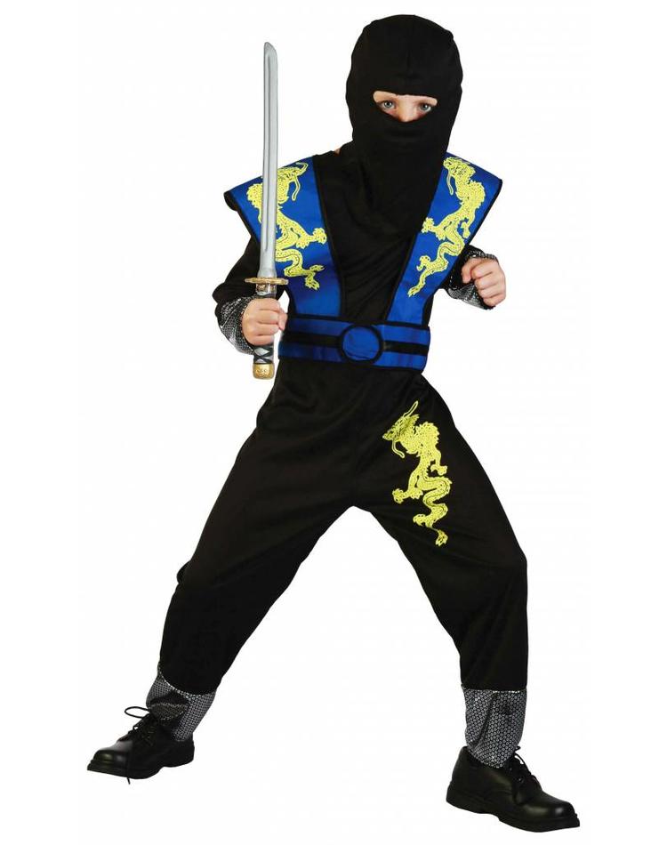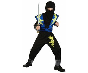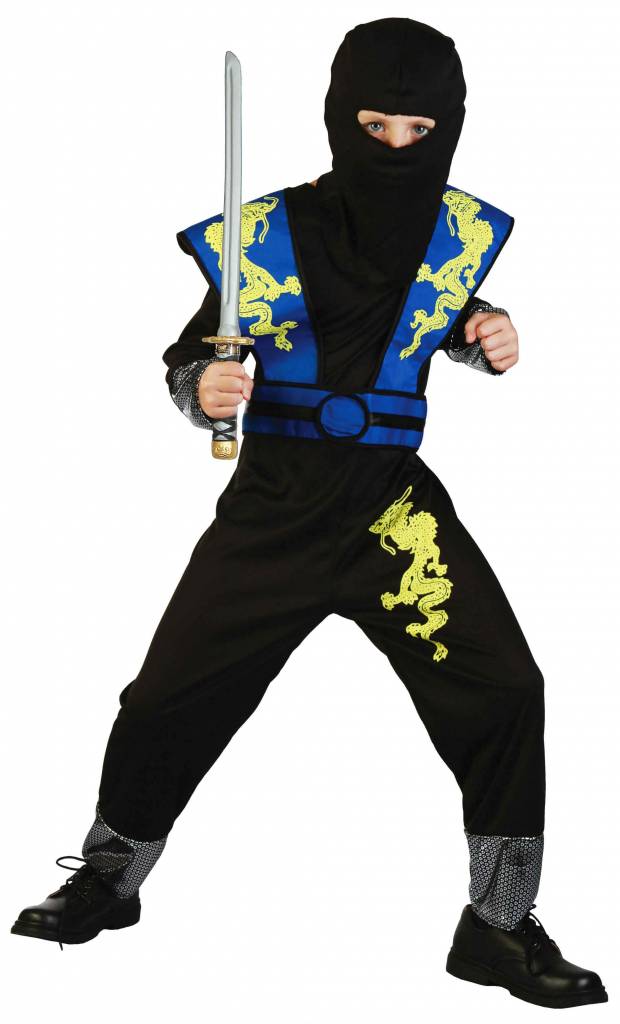 Das Dragon Ninja Jungenkostüm von Magicoo ist ein tolles Faschingskostüm für kleine Kampfsportfans. Das Kostüm besteht aus einem schwarzen Overall mit gelben Drachenprint am Oberschenkel und silbernen Absätzen an den Knöcheln und Handgelenken. Darüber hinaus gehört eine blaue Rüstung mit Gürtel zum Lieferumfang. Auf der Rüstung sind ebenfalls gelbe Drachen abgedruckt. Der Overall bedeckt das Gesicht fast vollständig und lässt lediglich Augen und Nase frei. Da muss man im ersten Moment überlegen, wer sich unter dem tollen Kostüm verbirgt. Zu dem Ninja Kinderkostüm passten am besten schwarze Turn- oder Schnürschuhe. Wer möchte, kann die furchteinflößende Dragon Ninja Verkleidung um ein langes Schwert ergänzen. Verschiedene Modelle sind im unseren Shop erhältlich.