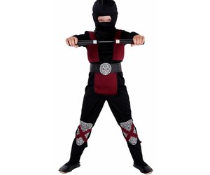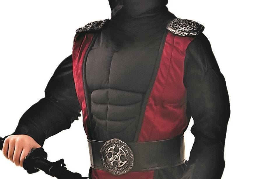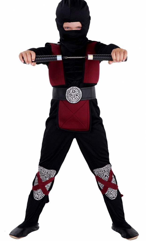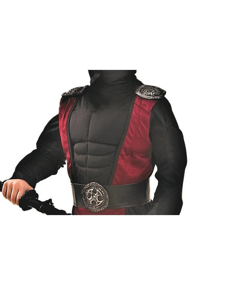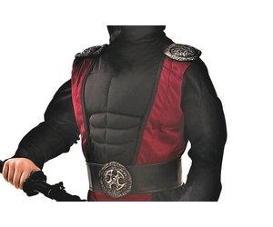 Dieses Ninja-Kostüm ist "maximal ausgestattet", wie man heute so schön sagt. Es setzt sich aus folgenden Teilen zusammen: Da ist zum einen die schwarze, eng anliegende Hose mit angedeuteten silbernen Schützern an den Unterschenkeln (samt überkreuzter weinroter Bänder). Zum anderen ist da das aufwendig gestaltete Oberteil mit schwarzen muskelbepackten Armen, Bauch und Brust samt einer weinroten Weste mit coolen silbernen Emblemen an den Schultern und an der Vorderseite des Gürtels, die allesamt Motive aus der Welt der Ninja-Kämpfer zeigen.