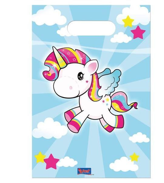 Nehmen Sie die Magie mit nach Hause! Süße Partytüten im Einhorn-Design lassen Ihre Gastgeschenke besonders niedlich erscheinen. Zusätzlich sind die Mitbringsel in den Partytüten gut verpackt. Ein weißes Einhorn mit Regenbogenmähne auf blauem Grund lässt nicht nur Kinderherzen höherschlagen. Passend dazu erhalten Sie eine Einhorntischdecke sowie Servietten mit dem gleichen Motiv.