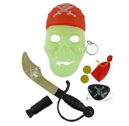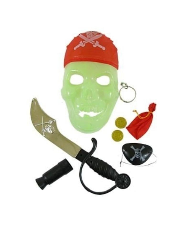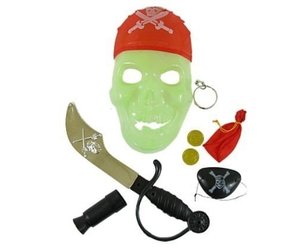 Lieferumfang: Piraten Set inkl. Piraten-Maske, eine Augenklappe, einen Säbel, Tasche mit Münzen und ein Teleskop
