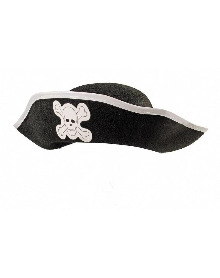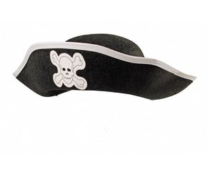 Mit diesem Piratenhut für Kinder ist ein kleiner Pirat bereit für große Fahrten auf hoher See. Der Piratenhut ist schwarz und die Krempe mit einem strahlend weißen Rand umnäht. Vorne trumpft er mit großer, weißer Totenkopfapplikation auf und lehrt die Feinde das Fürchten.