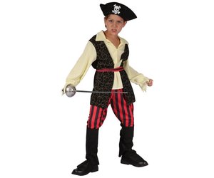 Mit dem schicken Kostüm kann Ihr Piratenjunge den anderen Kindern bei der nächsten Faschingsparty das Fürchten lehren. Das Kinderkostüm besteht aus einer rot-schwarz gesteiften Piratenhose, schwarzen Überschuhen und einer schwarzen Weste mit Goldfaden-Print. Die Weste ist an ein beiges, an den Ärmeln ausgefranstes Piratenhemd angenäht. Das Highlight des Piratenkostüms ist der schwarze Piratenhut mit furchteinflößendem Totkopfprint. Unter die schwarzen Überschuhe passen am besten Turnschuhe oder Lackschuhe in einer dunklen Farbe. Mit schwarzer Faschingsschminke können Sie noch eine beeindruckende Narbe auf das Gesicht Ihres Seeräubers malen.