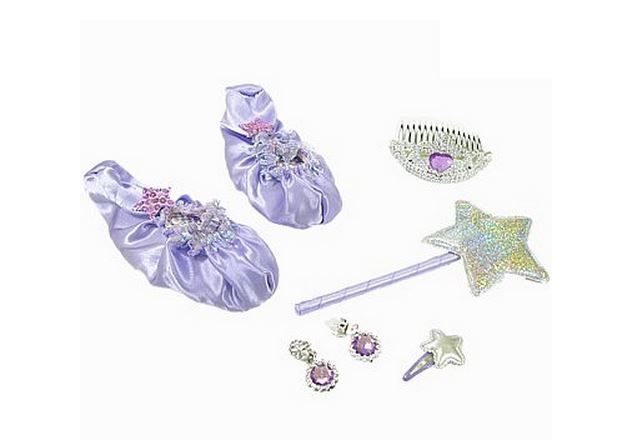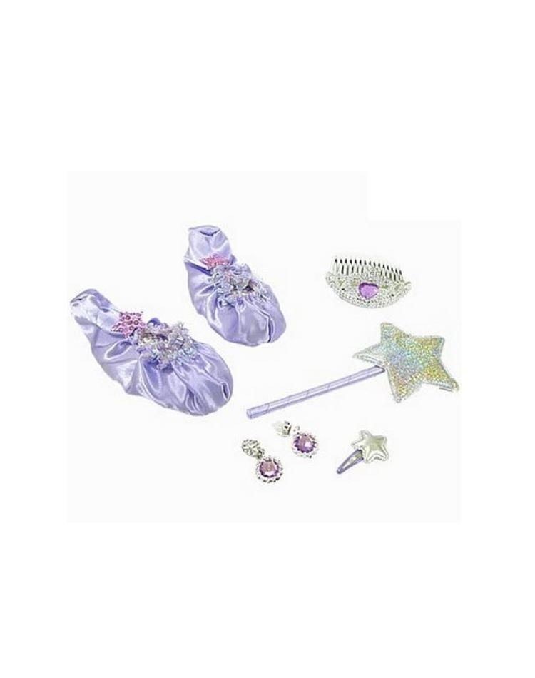 Der Prinzessin-Set lila für Kinder besteht aus Ballettschuhen in Lila, einer Haarspange, Ohrclips, einem Mini-Diadem mit Kamm und einem Zauberstab. Der Set für Prinzessin lässt sich gut mit lila und rosa Prinzessinnen-Kleidern kombinieren.