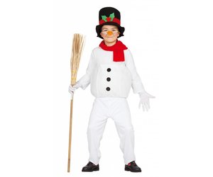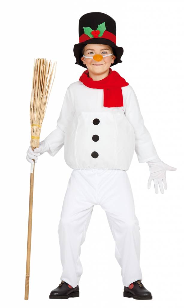 Das Schneemann Outfit besteht aus einer weißen Hose und dem passenden weißen Oberteil mit drei runden schwarzen Knöpfen auf der Vorderseite sowie einem knallroten Schal, der für einen der Farbtupfer sorgt. Weitere Farbelemente bringen die orange Karottennase, die man sich mit einem Gummiband am Gesicht festmacht und der schwarze Zylinder mit rotem Band und winterlicher Verzierung in Rot und Grün an der Vorderseite. Komplettieren kann man das ganze Kostüm durch den typischen Schneemann-Besen. Der Besen ist im Lieferumfang nicht enthalten.